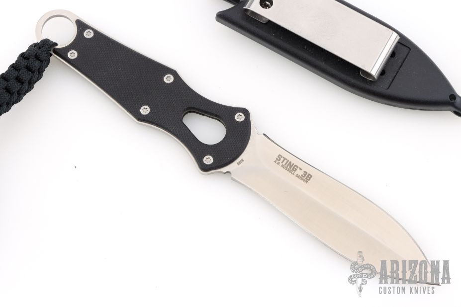 Based on the A.G. Russell Sting, the CRKT Sting 3B is a slim, lightweight boot knife variation. Its satin finished dagger blade has a combat ready double-edge and textured G-10 scales provide positive grip. The time-tested design of the Sting fixed blade will inspire confidence in the field and prove itself a worthy addition. CRKT outfitted the Sting 3B with a glass-reinforced nylon sheath that includes a removable stainless steel spring clip for attachment to a boot, gear, or belt.