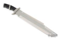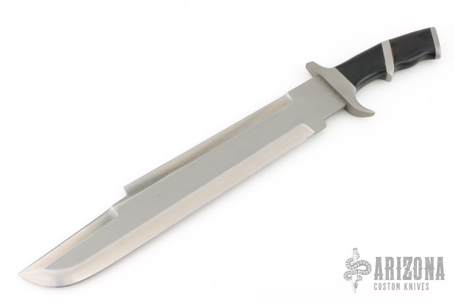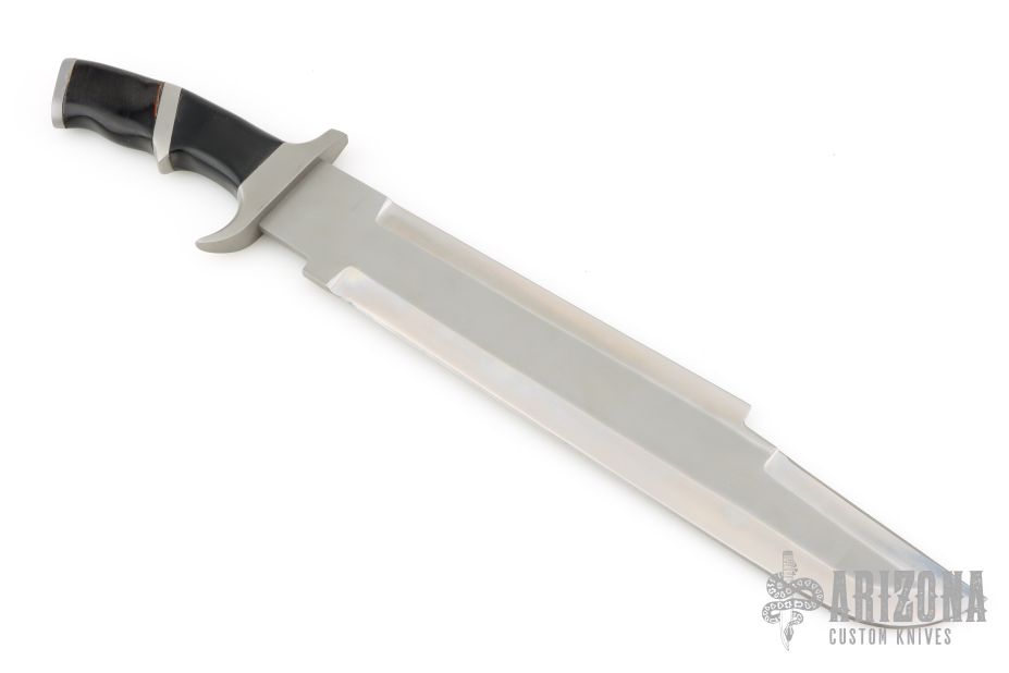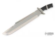 This Custom Predator Machete by Jack Crain features a bead blasted blade with a sharpened top and bottom edge, .221" blade stock and 2.557" blade depth, hidden tang construction.  The handle has a bead blasted stainless guard, sub-hilt, black linen micarta and laminated wood grip.  Light scuffs and scratches are visible on the blade and handle otherwise the knife is in good condition.