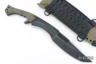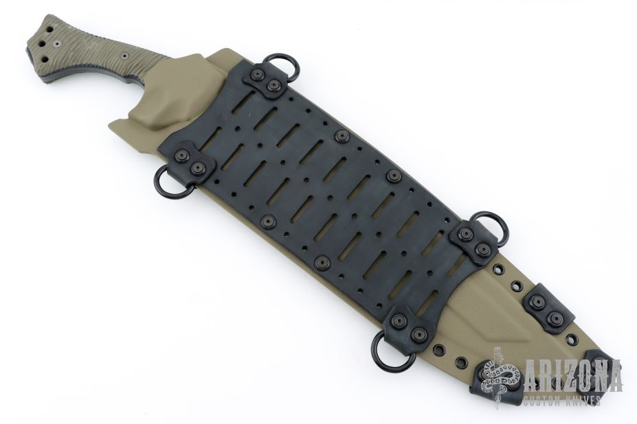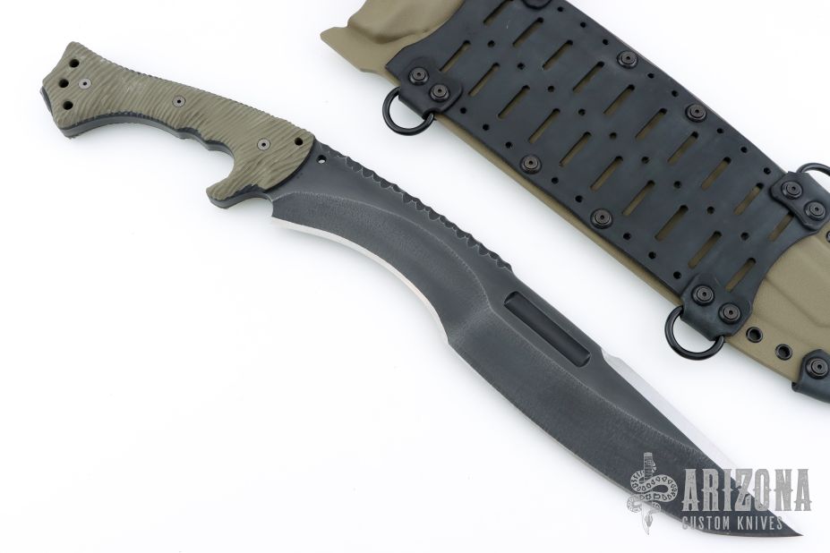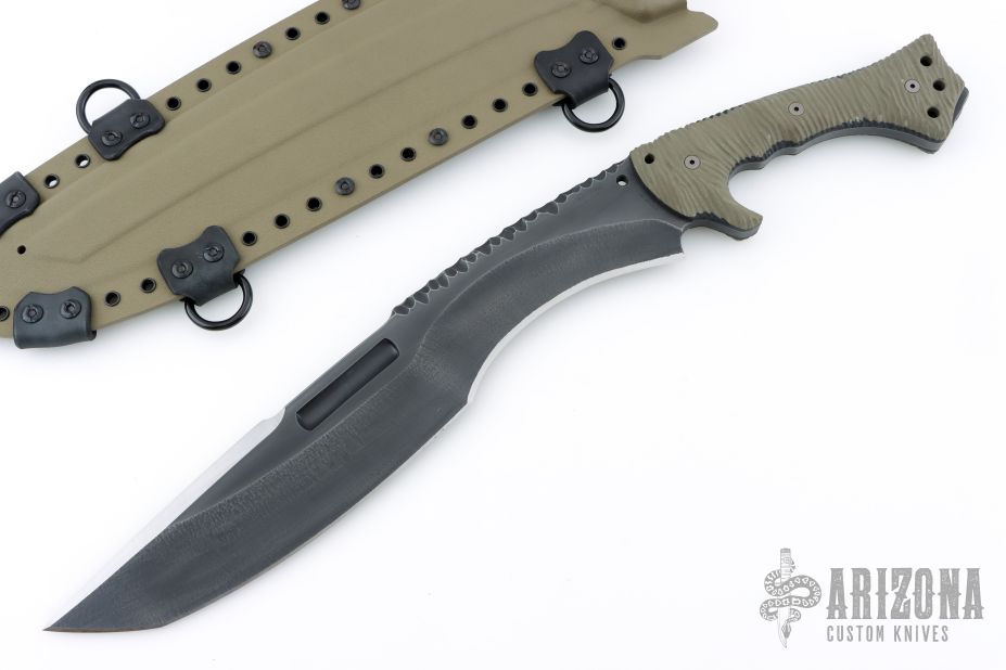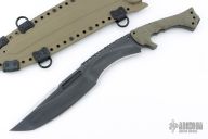 This M-19 by Miller Bros Blades features a coated blade with sharpened top edge, fullers, textured spine, made from Z-Wear PM steel, .283" blade stock 2.620" blade depth, full tang construction. The handle has textured green G-10 scales with black liners, notched tang, lanyard hole in extended tang. Comes with a Kydex and leather sheath and COA dated 2025. New from maker.