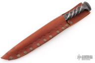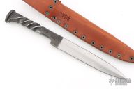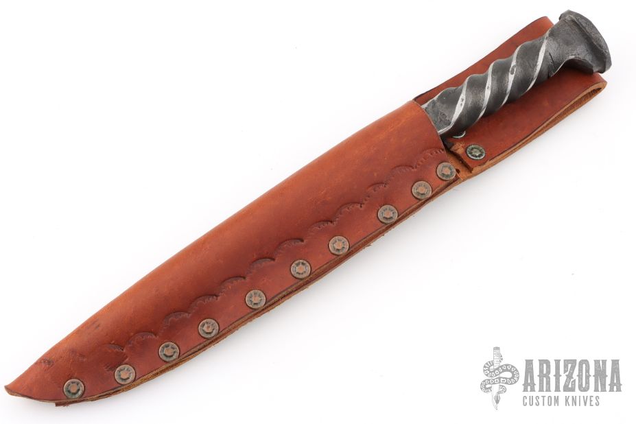 This Railroad Spike Knife from Impaler Knives by JZ features a hand forged satin finished blade with .268" blade stock and 1.134" blade depth, integral construction. Comes with a leather sheath. Has some light scratches and patina on the blade, otherwise excellent condition.