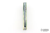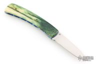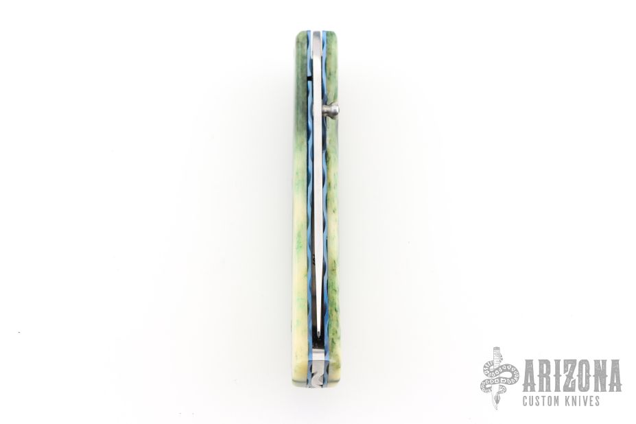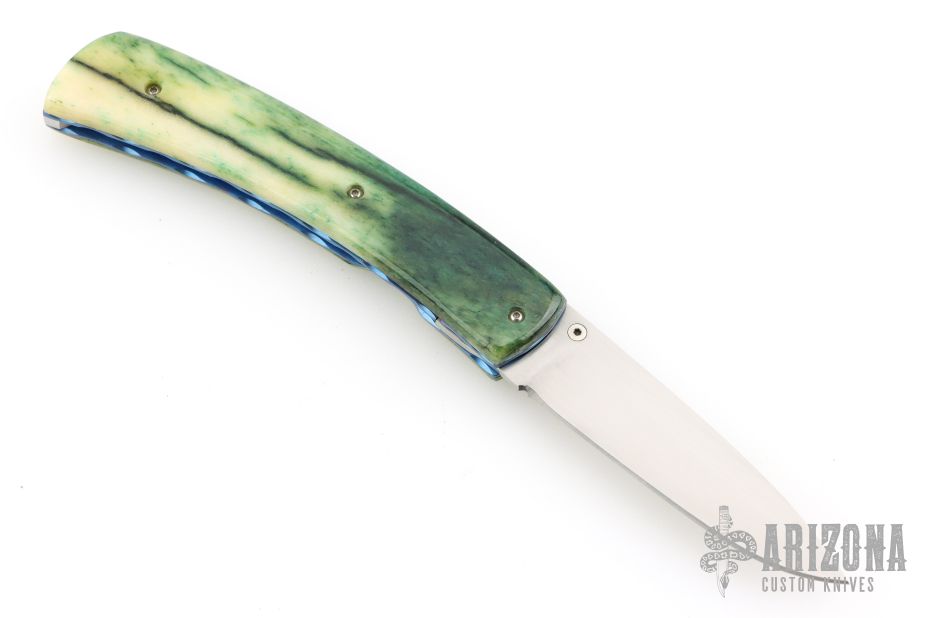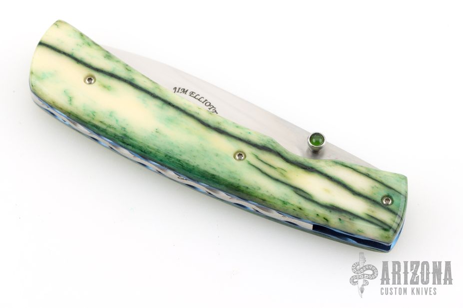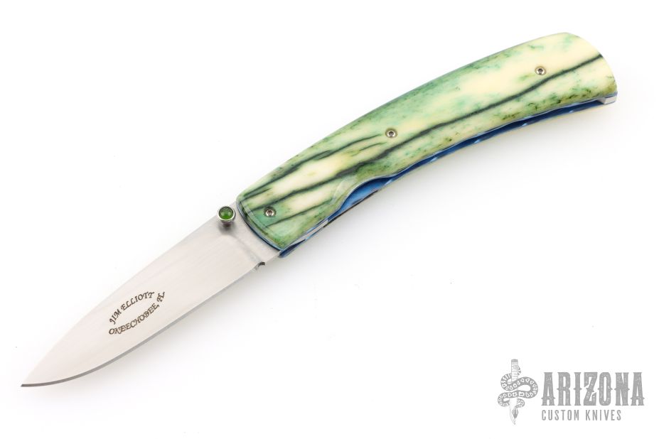 This linerlock by Jim Elliot features a hand rub satin finished blade with a single thumbstud with a green stone inlay. The handle has dyed giraffe bone scales, fileworked and anodized titanium liners, fileworked stainless steel backspacer. Nice detent, lockup and blade seating. Excellent condition. Comes with a felt pouch. #789