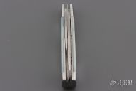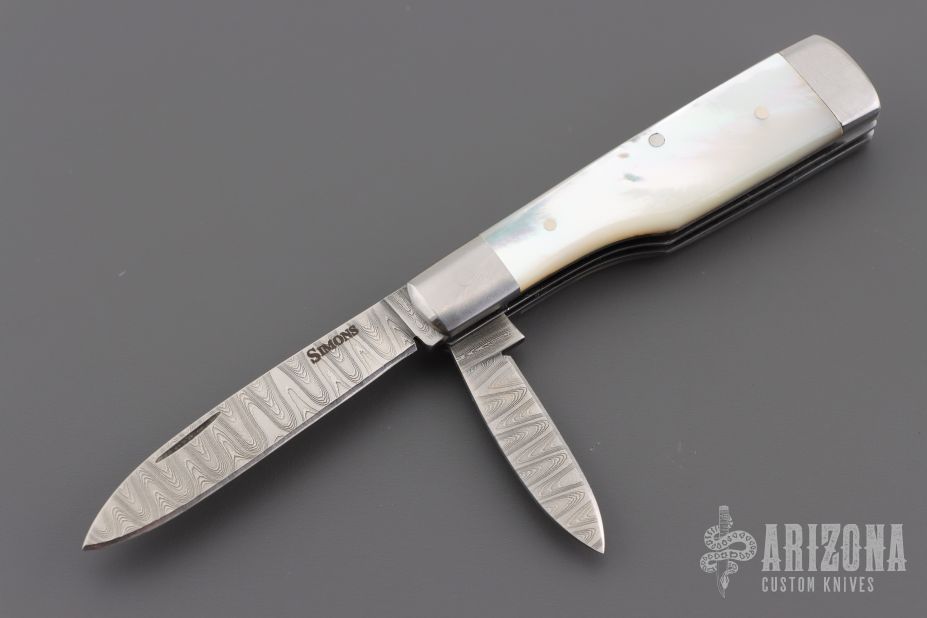 This slipjoint by Bill Simons features Damascus blades with nail nicks. The handle has stainless steel bolsters, mother of pearl covers, fileworked stainless steel liners, and stainless steel springs. Has half-stops, flush in all positions. #356. Excellent condition. Comes with a zippered case.