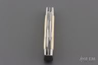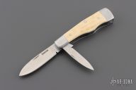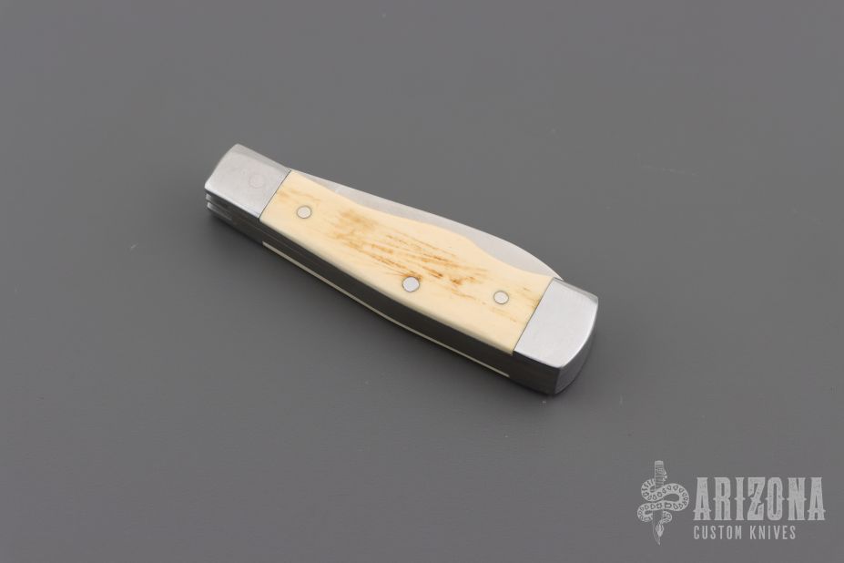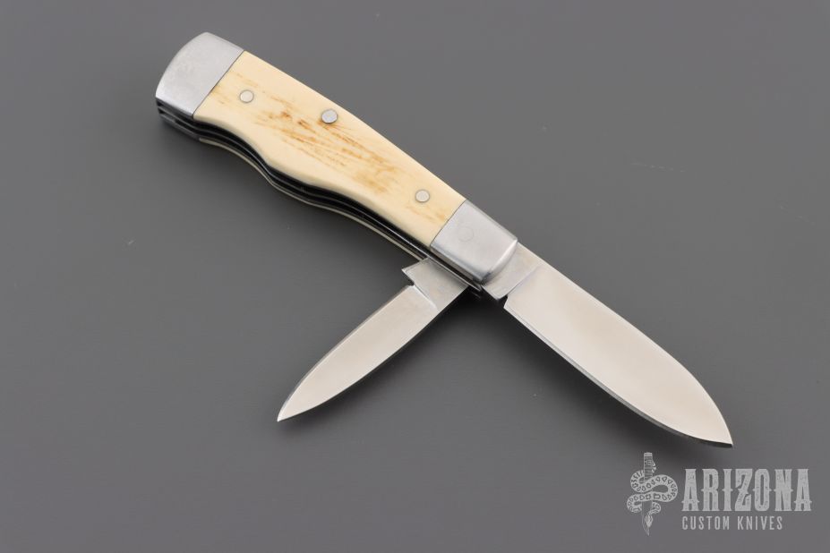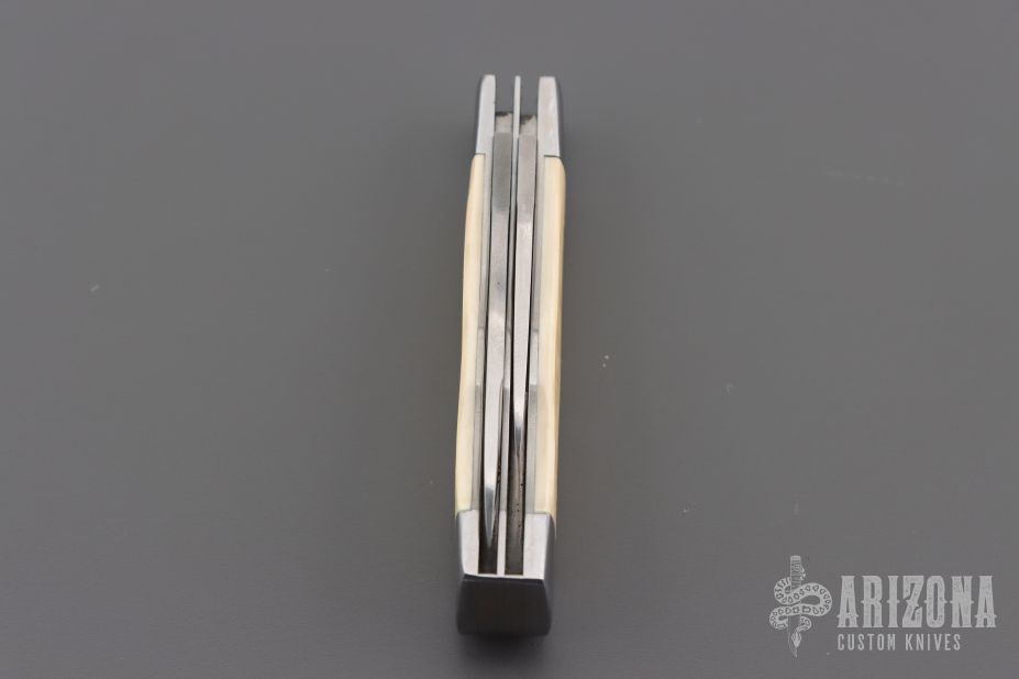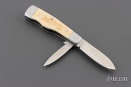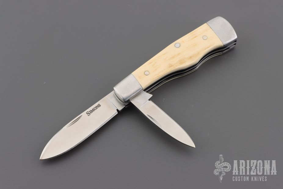 This slipjoint by Bill Simons features satin finished blades with nail nicks. The handle has stainless steel bolsters, mammoth ivory covers, stainless steel liners, and stainless steel springs. Has half-stops. #370. Excellent condition. Comes with a zippered case.