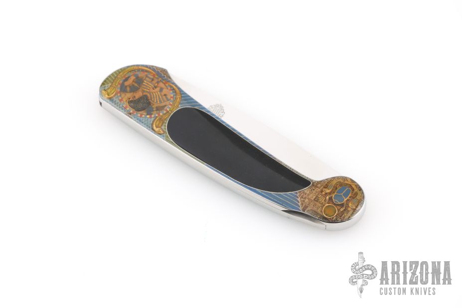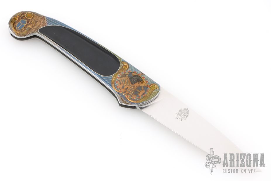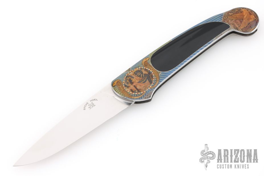 This Interframe lockback by Steve Hoel features a hand rub satin finished blade. The handle has a stainless steel interframe handle with Egyptian Jade inlays. The engraving is of an Egyptian Pharaoh, cobras, wadjet and a scarab engraved by Gary Blanchard and has enamel inlays as well. Excellent condition. Nice blade seating and a lockup. Comes with a zippered case.