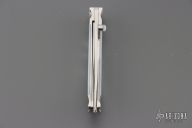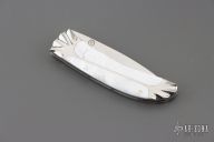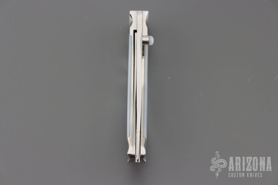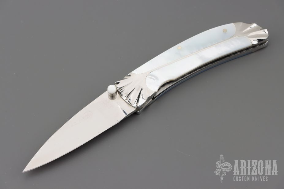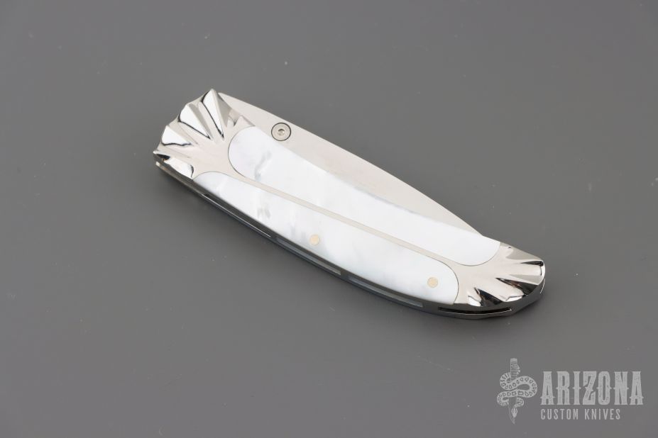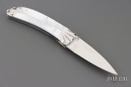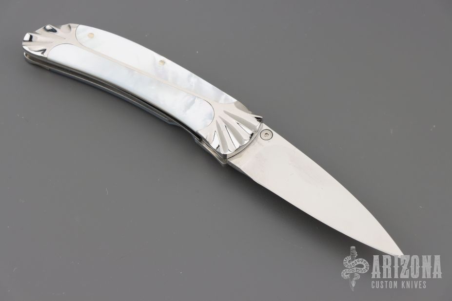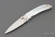 This linerlock folder from Koji Hara features a mirror polished blade with single mother of pearl thumbstud. The handle has a mirror polished and fileworked stainless steel frame with mother of pearl inlays, stainless steel backspacer with mother of pearl inlays. Smooth action. Nice lockup, detent and blade seating. Excellent condition. Includes a zippered case.