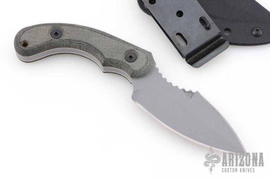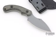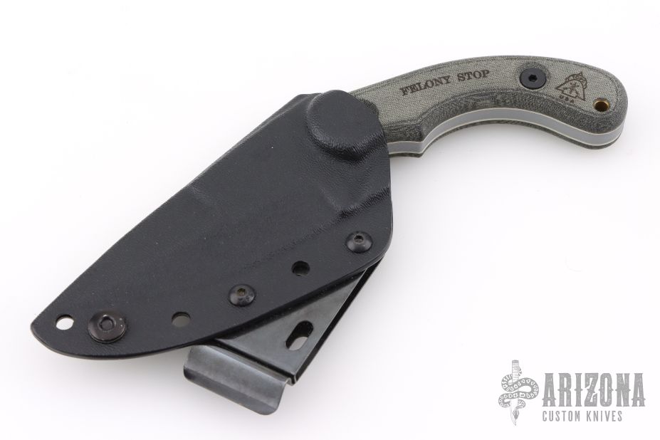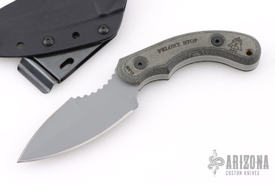 This Felony Stop is a Laci Szabo design produced by Tops, it has black linen micarta scales and white liners. Gray coated blade with both edges sharpened. Notched thumbrest. Includes black kydex sheath. Has a couple light scuffs, otherwise Excellent condition.
