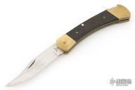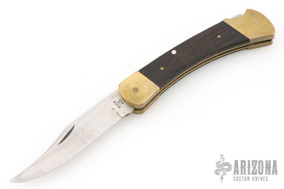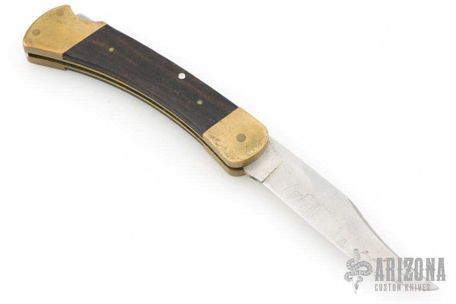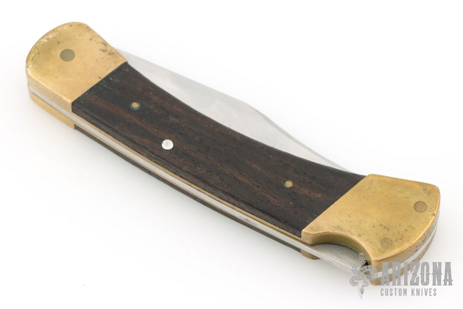 This vintage Buck 110 "folding hunter" features a satin finished clip point blade with nail nick. It has wood scales, brass bolsters and frame. Has some patina and scratches, has been resharpened. Great overall condition otherwise.