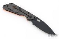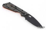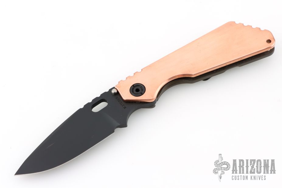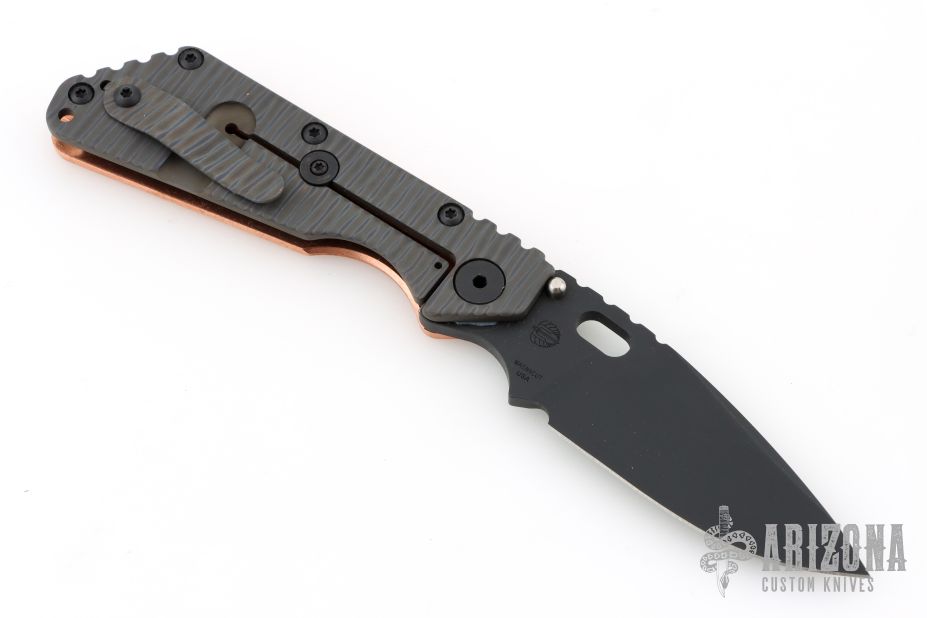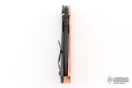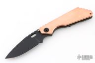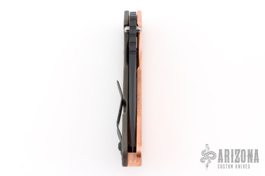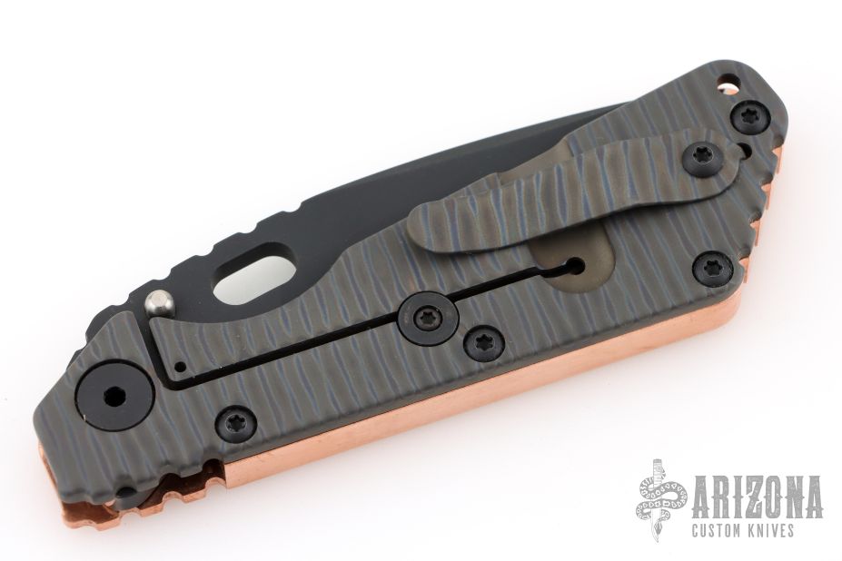 This Mick Strider SMF framelock folder features a black oxide finished spear point blade with thumbhole and notched thumbrest. The handle has a copper and flame finished titanium frame with titanium clip, tip up carry. Jimping on blade spine. Includes Hinderer "Lock Bar Stabilizer" for maximum reverse lock retention. Nice detent, lockup and blade seating. Has some light scuffs, otherwise excellent condition.