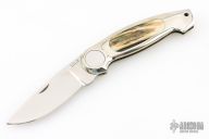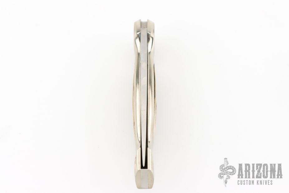 This Button Lock Folder from Jimmy Lile features a satin finished blade with nail nick, #135 on blade. The handle has a nickel silver frame with stag inlays. Large button lock release mechanism used to open and close the knife. Numbered "85" on inside of backspacer. Excellent condition.