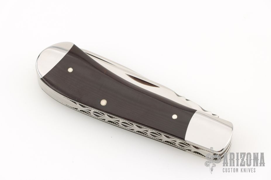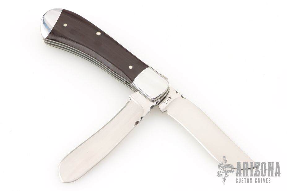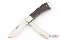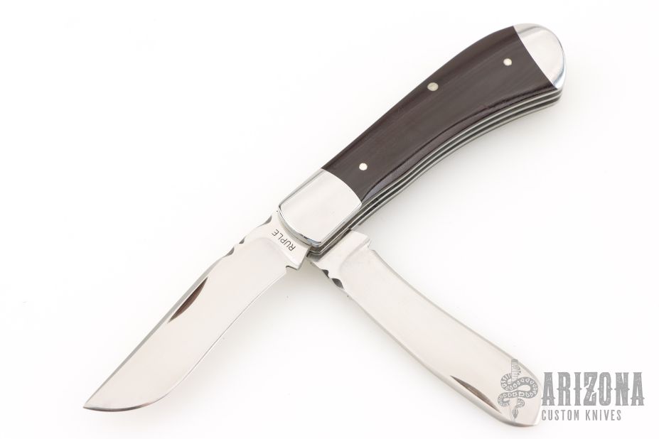 This Two-Blade Trapper by Bill Ruple features hand rub satin finished blades with nail nicks and fileworked spines. The handle has dovetailed stainless steel bolsters/caps, micarta covers, coin edge stainless steel liners, fileworked stainless steel springs. #A98 on the blade. Comes in a zipper case. Has some light scratches, great overall condition.