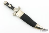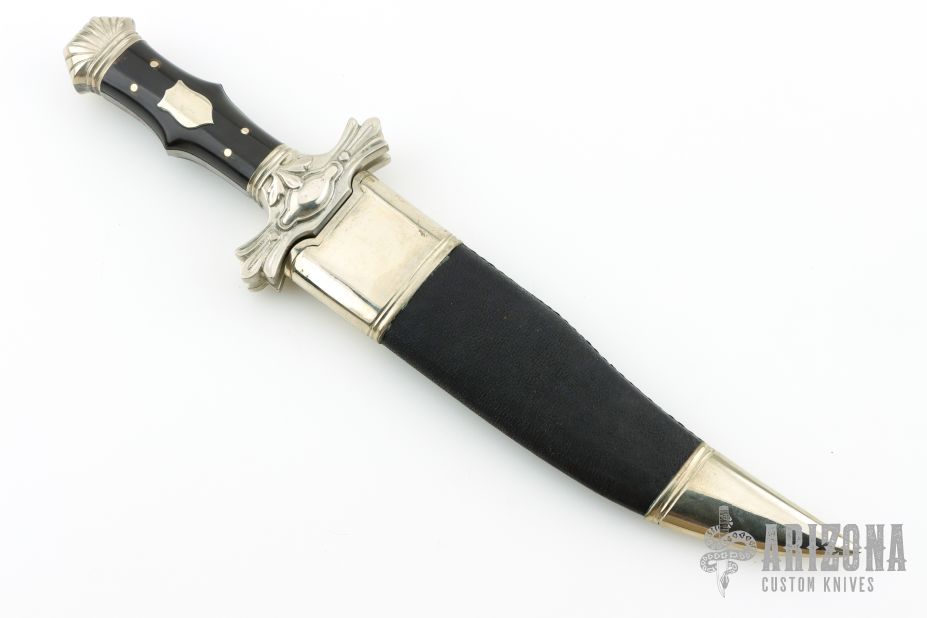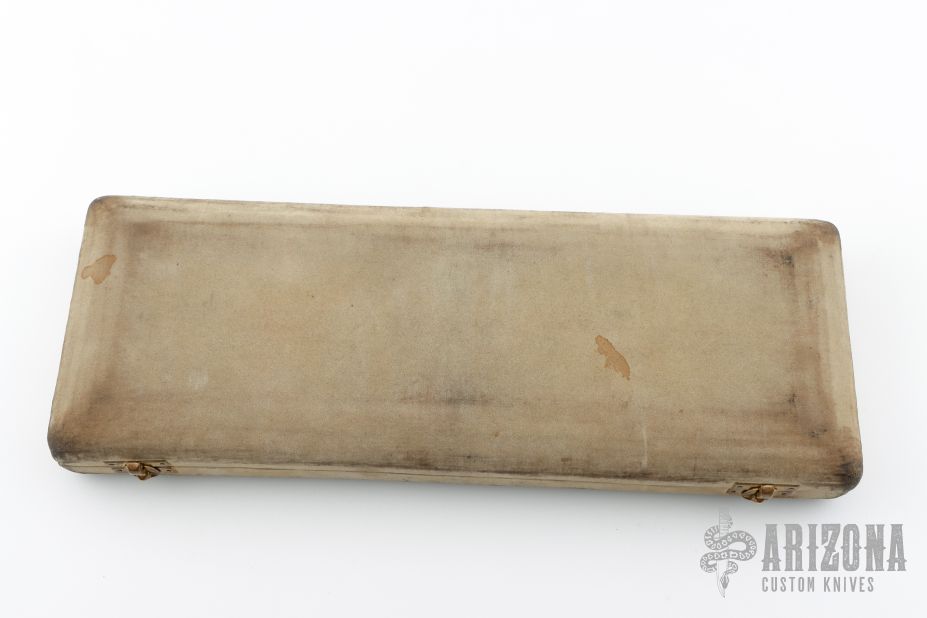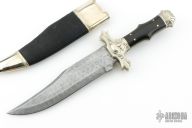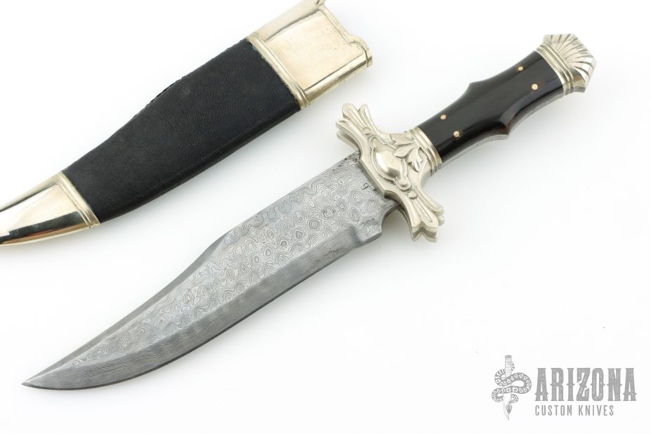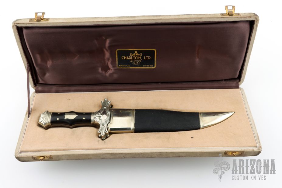 This Presentation Bowie by Charlton LTD features a Damascus blade with false top edge and gold inlaid engraved makers mark, .233" blade stock and 1.616" blade depth, full tang construction. The handle has nickel silver bolsters front and rear with filework, buffalo horn scales with nickel silver pins and escutcheon. Comes with a presentation box and original black leather sheath with nickel silver fittings. Has some light patina/oxidation that is mostly on the tang and ricasso, otherwise excellent condition. #9 on the blade.