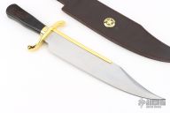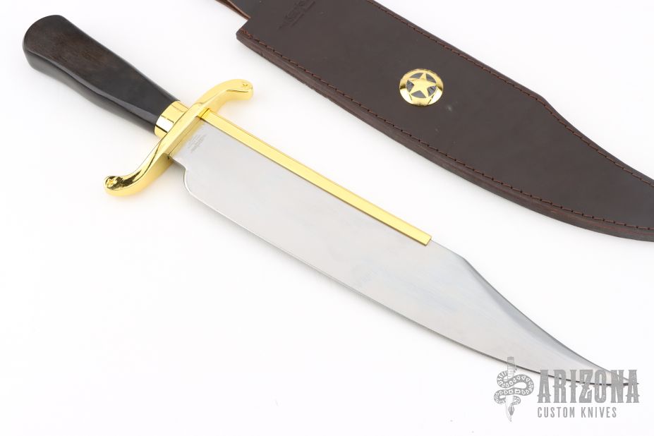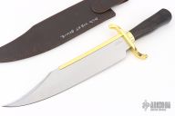 This knife is an actual copy of a typical Bowie knife of the 1830s. The story of the Bowie began on a sandbar of the Mississippi River above Natchez, Mississippi on September 19, 1827. A brawl that eventually involved Col. James “Jim” Bowie, who, having been shot and stabbed, successfully defended himself killing Major Norris Wright and wounding Alfred Blanchard with what onlookers described as a “large butcher knife.” This and other tales of Bowie’s abilities with a knife led to the widespread popularity of what became known as the “Bowie” knife. 14” ov.