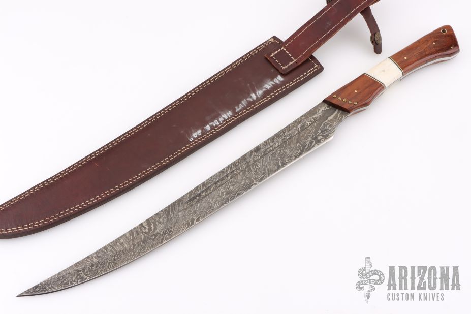 This Fighter by Timber Wolf features a Damascus blade with a fuller, .195" blade stock and 1.667" blade depth, full tang construction. The handle has a wood/bone/brass covers with lanyard hole in pommel. Comes with a brown leather sheath. Has some inclusions in the Damascus, and some patina otherwise excellent condition.