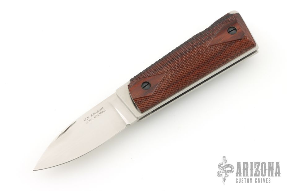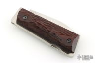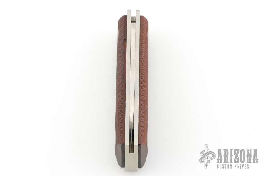 This lockback folder by WE Ankrom features a hand rub satin finished blade with nail nick. The handle has hand checkered cocobolo 1911 grip covers, stainless steel liners, and a stainless steel lockbar. Nice lockup and blade seating. Very smooth. Excellent condition. Comes with a zippered case.