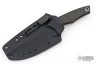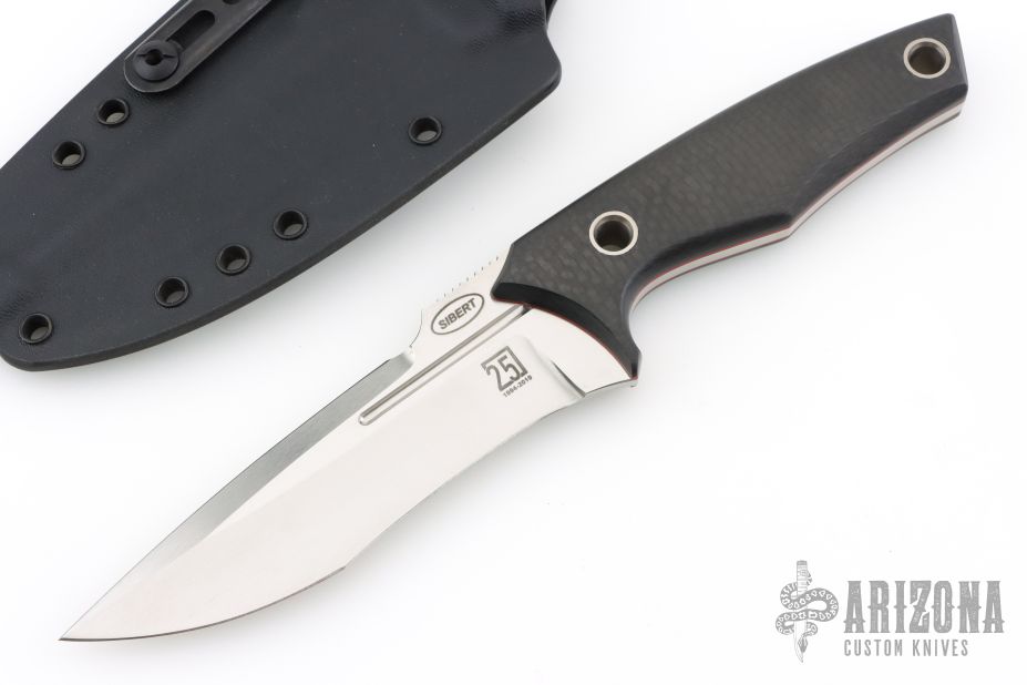 This Subversive from Shane Sibert features a hand rub satin finished blade with swedge, fullers and notched thumbrest, .175" blade stock and 1.460" blade depth, full tang construction.  Sharpened top edge. The handle has carbon fiber scales over red G-10 liners.  Includes a Kydex sheath and a padded zippered case.  Excellent Condition.
