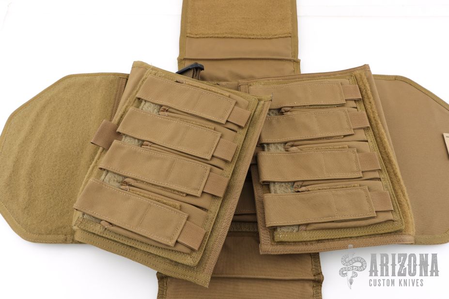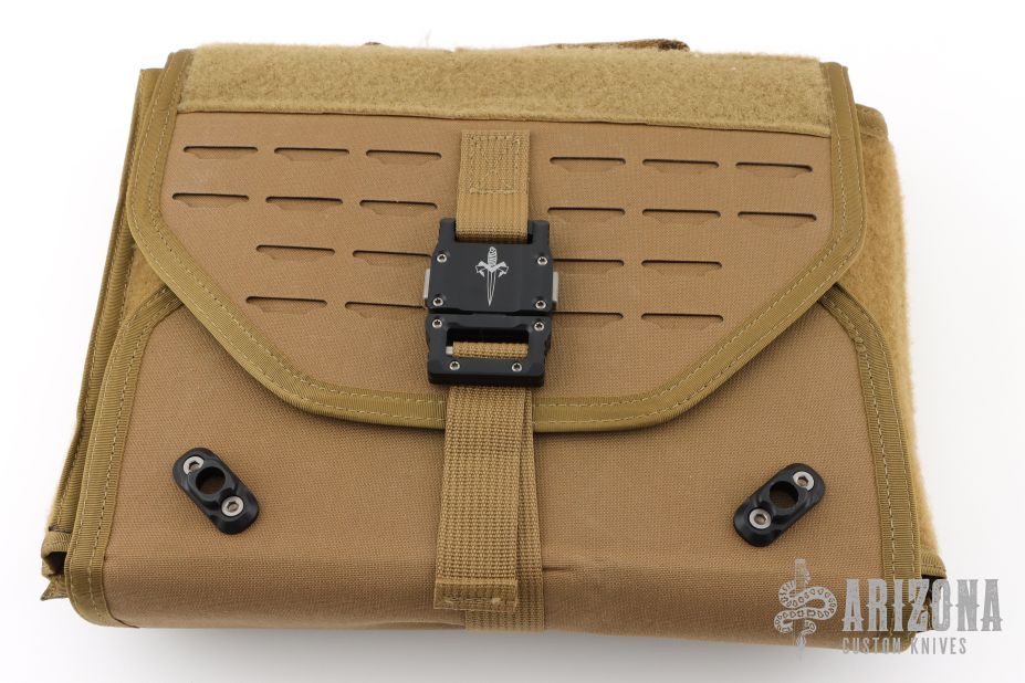 Marfione Custom BADMF Bag in Coyote. Has removable velcro panels that hold knives or magazines. Excellent condition. 12" x 9" x 3.5" closed and empty. Comes with a matching Magpul RLS rifle sling with Magpul QD Swivels