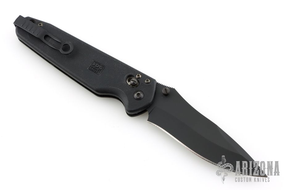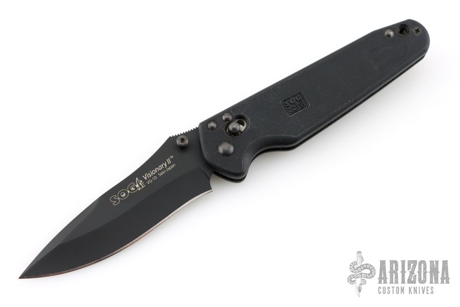 This Visionary II by SOG Knives features a black recurve blade with dual thumbstuds and notched thumbrest. The handle has a black FRN grip with a tip up reversible black stainless steel clip. Comes with original box. Excellent condition.