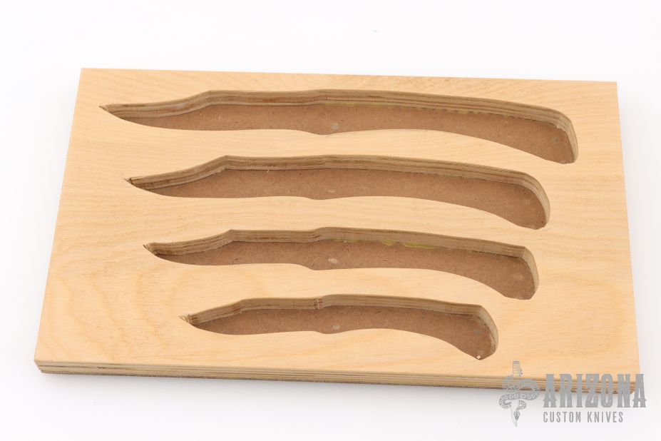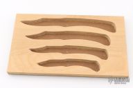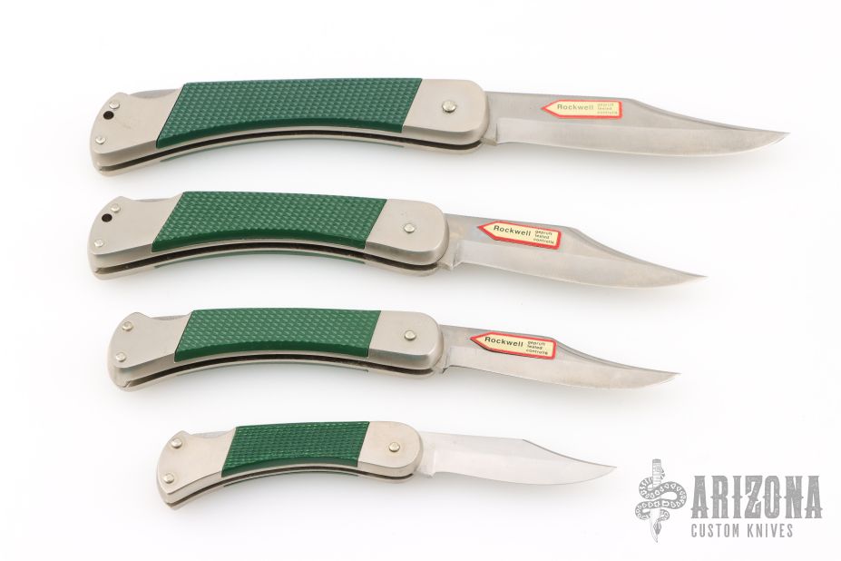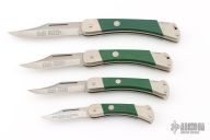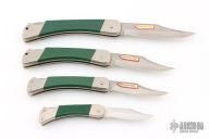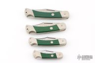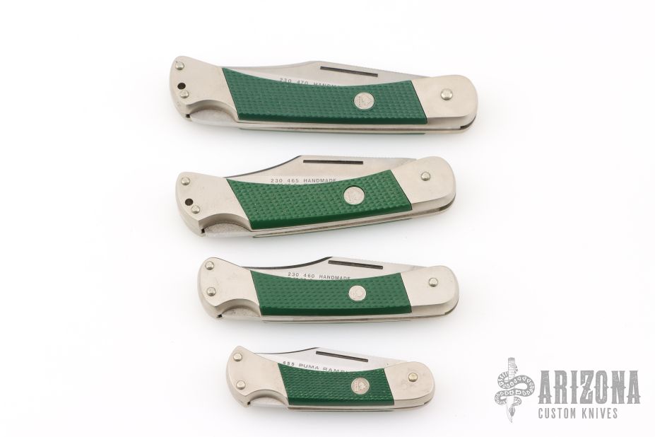 These lockback folders by Puma Knives feature satin finished clip point blades with nail nicks and notched thumbrests. They have nickel silver frames with green insets and stainless steel backspacers. This set of four comes with a custom wooden display plaque. There are a couple very light scratches, otherwise they are all in excellent condition.