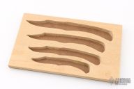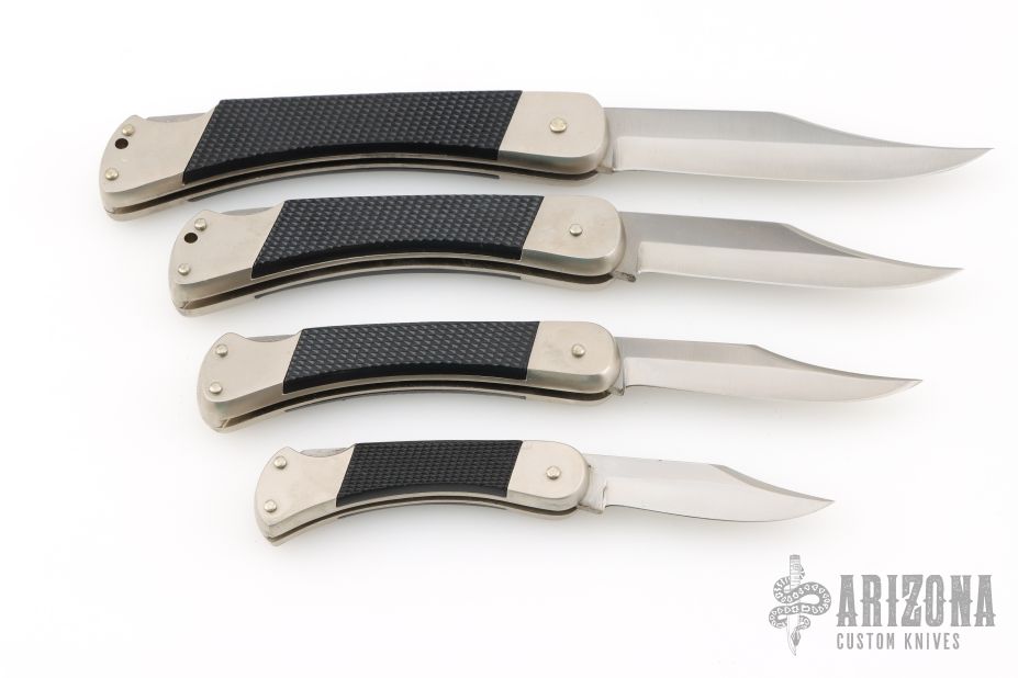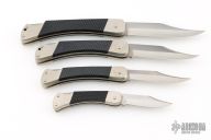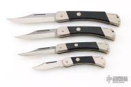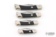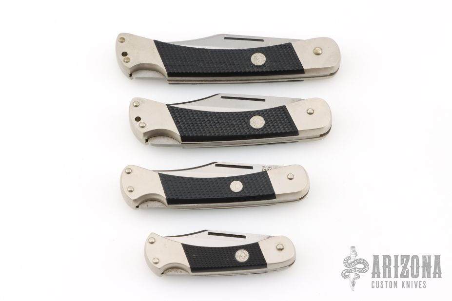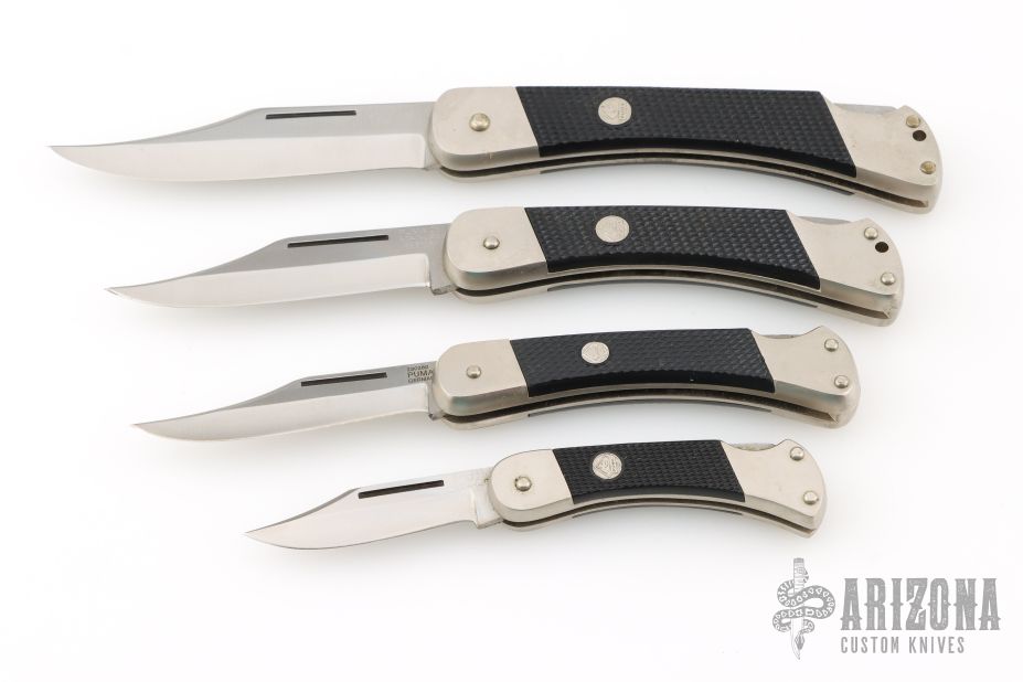 These lockback folders by Puma Knives feature satin finished clip point blades with nail nicks. They have nickel silver frames with black insets and stainless steel backspacers. This set of four comes with a custom wooden display plaque. Has some light patina, otherwise they are all in excellent condition.