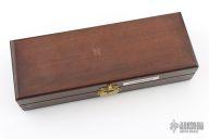 This Four Star Lockback from Puma Knives features a mirror finished drop point blade. The handle has nickel silver bolsters, ivory paper micarta scales with black liners, nickel silver liners and pins with a stainless backspacer. The scales have been scrimshawed, the b-side has information about the scrimshaw artist, but i can't read it. Comes with a wooden presentation box. Excellent condition.