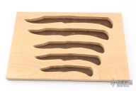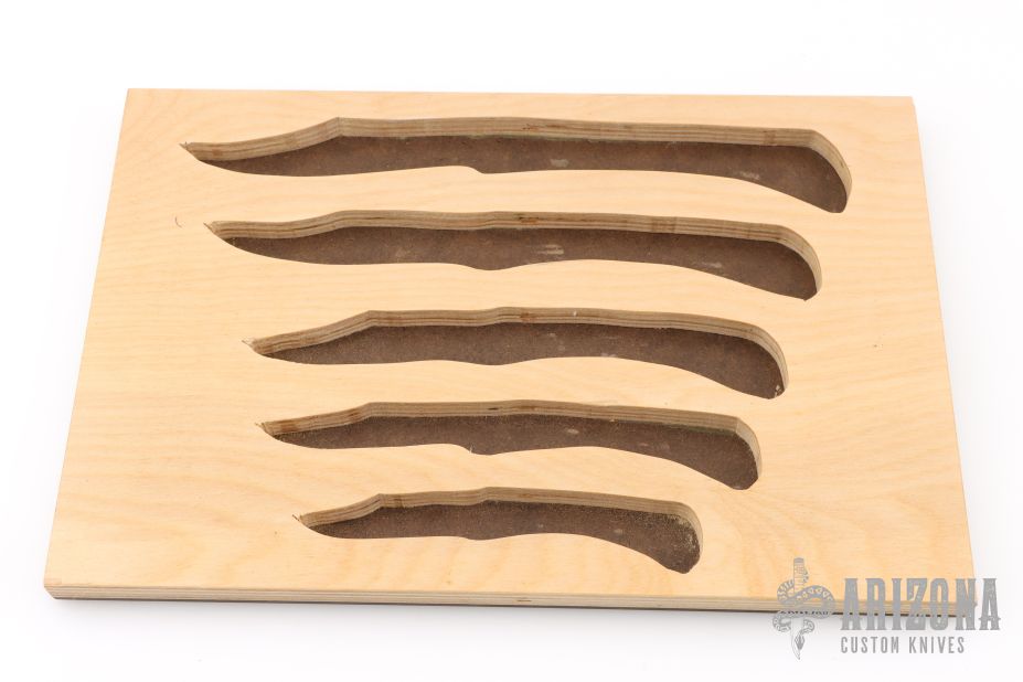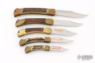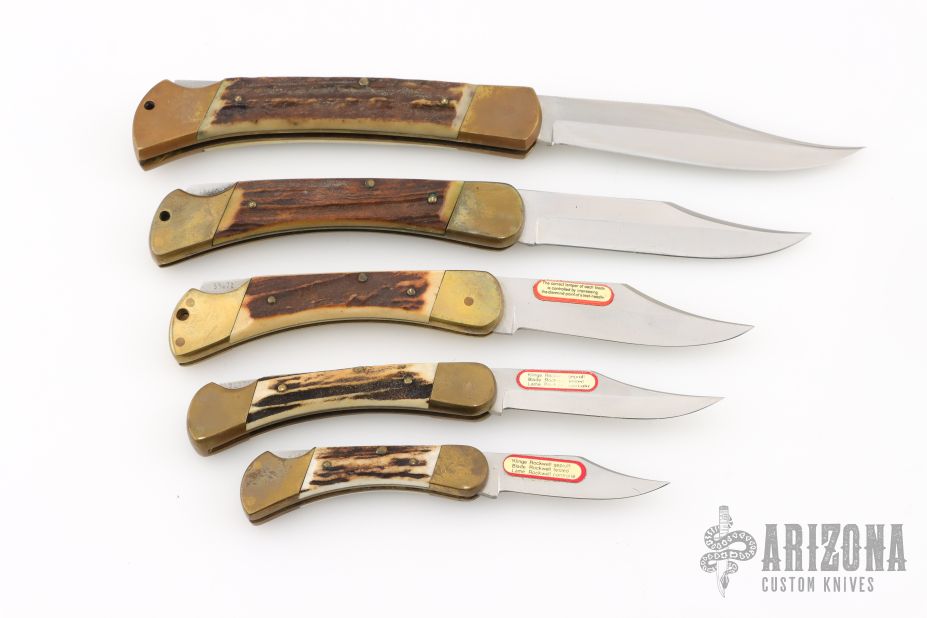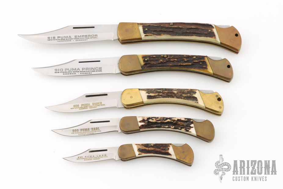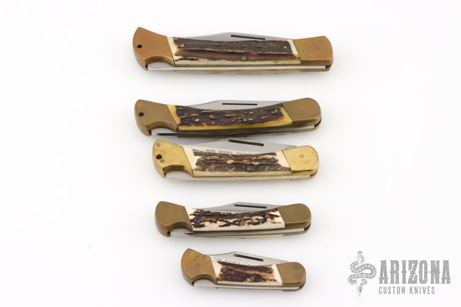 These lockback folders by Puma Knives feature satin finished clip point blades with nail nicks and notched thumbrests. They have brass frames with stag insets and stainless steel backspacers. This set of five comes with a custom wooden display plaque. Has some scratches on a couple of them and some light patina, otherwise excellent condition.
