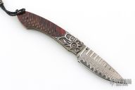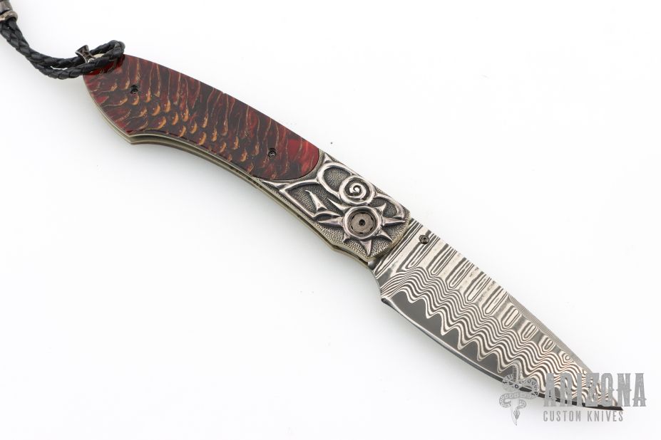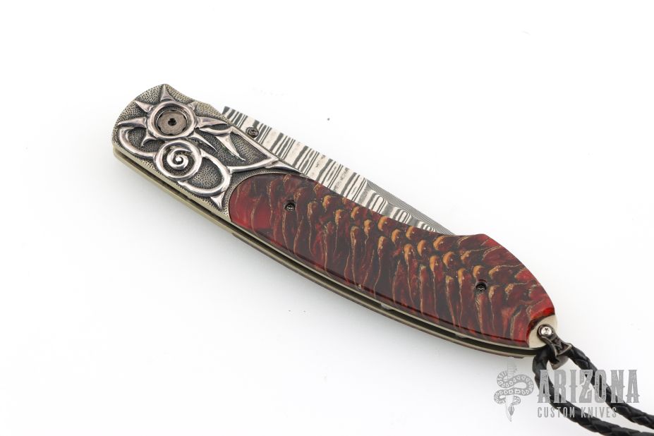 This B12 Red Lodge by William Henry Fine Knives features "Wave" Damascus blade with ZDP-189 core, single thumbstud with blazing red topaz inset in a gold bezel. The handle has a carved sterling silver frame with Norway Blue Spruce Cone scales, sterling silver lanyard bail with black leather lanyard and sterling silver beads. Nice lockup and blade seating. Comes with original box, sheath and COA dated 11/16/2017. Excellent condition. #18/50 made.