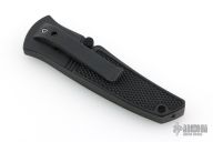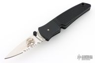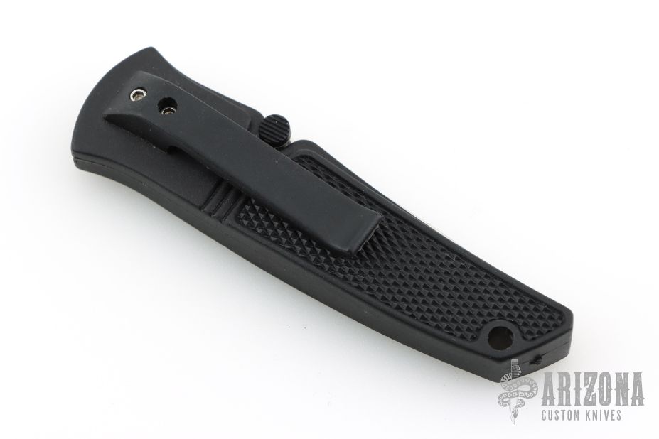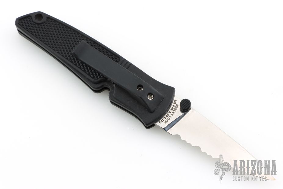 This knife by Abel features a polished serrated blade with dual thumbstuds. The handle is black FRN. This knife features the Neeley Lock. The knife opens normally, but to close the knife, pull the thumbstuds forward and the lock will release and the knife can close. Has some light scuffs and scratches, great condition otherwise.