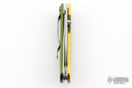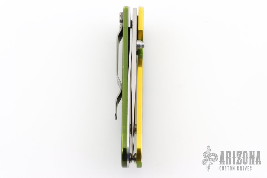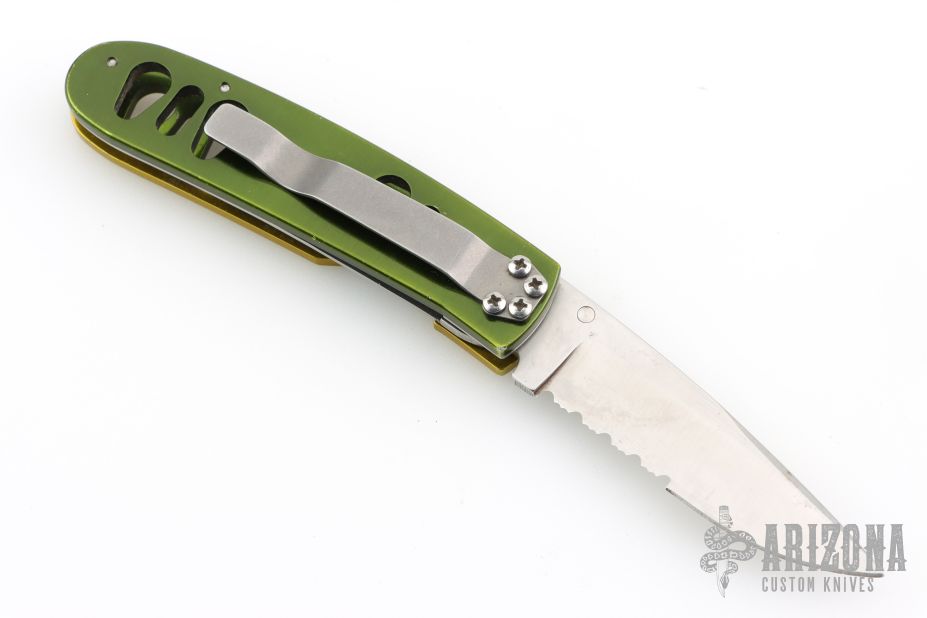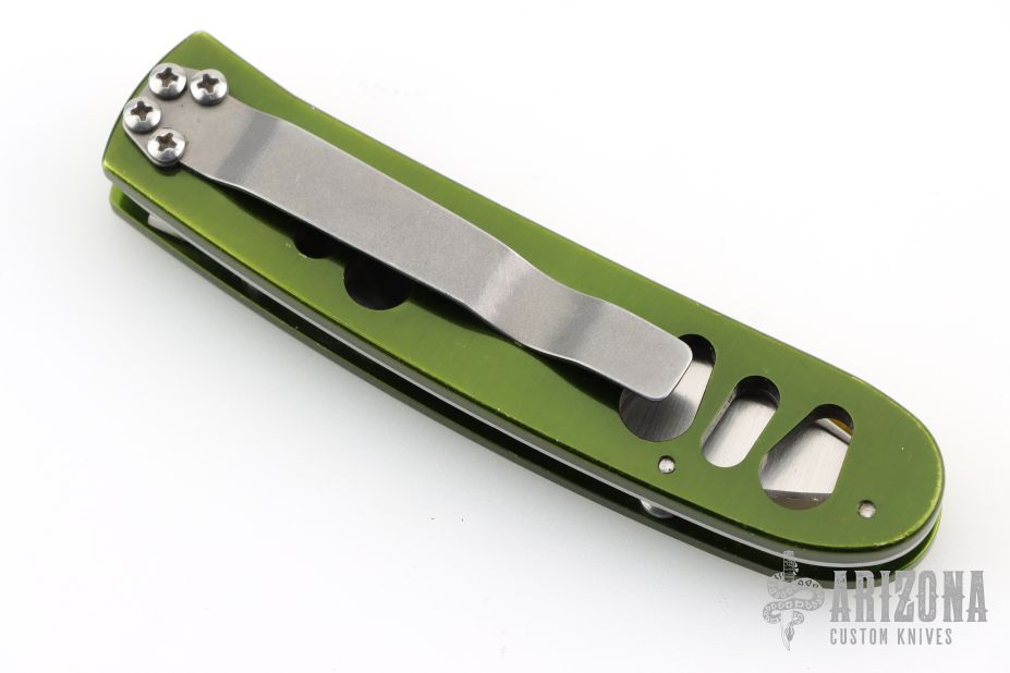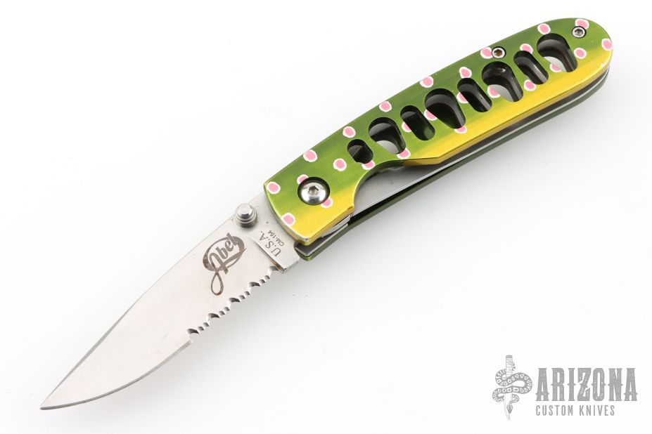 This knife by Abel Fishing Reels features a satin finished drop point blade and a single thumb stud. The knife is fully made in the USA of high carbon, high chrome, 154CM knife grade stainless steel. The blade is hardened to 60RC; the handle or frame of the knife is cold finished 6061-T6 aircraft quality aluminum. Bead blasted stainless steel tip down pocket clip. Has some light scuffs and scratches, great overall condition.