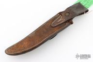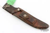 Vintage Model 3-7 Sheath. Johnson Roughback mid 1960s-1970s. No stone in the pocket. Has wear, the loop has a split near the stitching, and copper rivet has been added to the loop the mitigate this. fair condition.