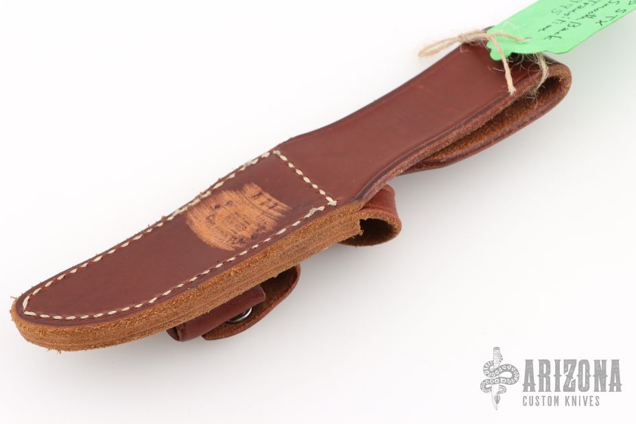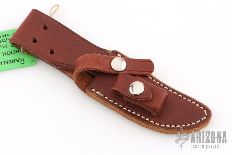 Randall Model 27 Mini Sheath with NO stone. This sheath is supposedly a Johnson Smoothback and Sullivans transitional period sheath that is a prototype/second. The makers stamp on the back has been ground off. Excellent condition.