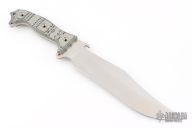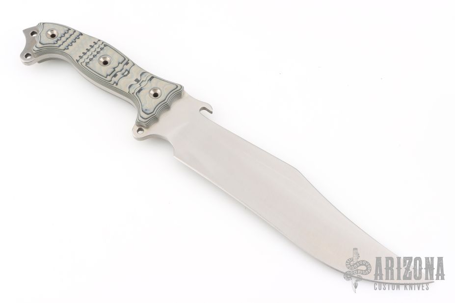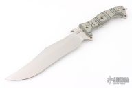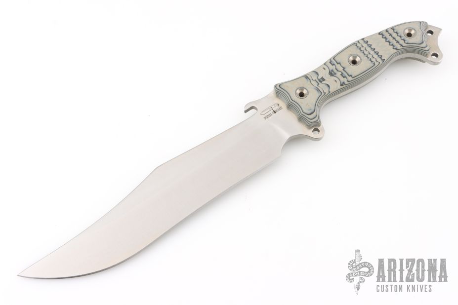 This Silent Knight by Busse features a satin finished recurve INFI blade with .214" blade stock and 2" blade depth, full tang construction. The handle has a tan/black G-10 scales, extended tang with lanyard hole. Excellent condition.