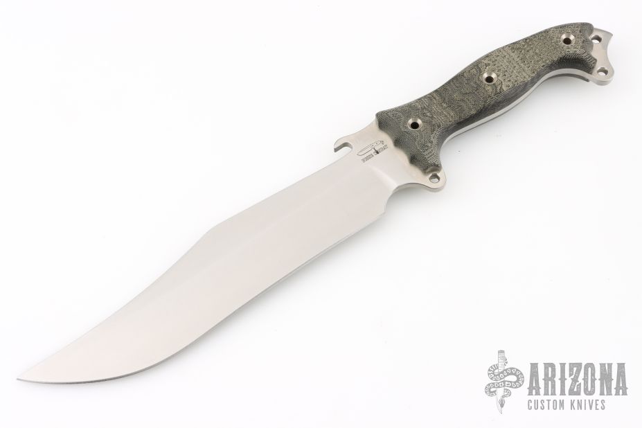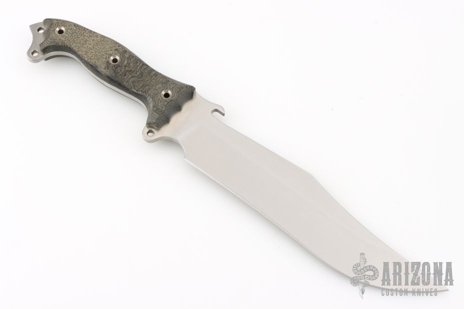 This Silent Knight by Busse features a satin finished recurve INFI blade with .212" blade stock and 1.993" blade depth, full tang construction. The handle has a black canvas micarta scales, extended tang with lanyard hole. Excellent condition.