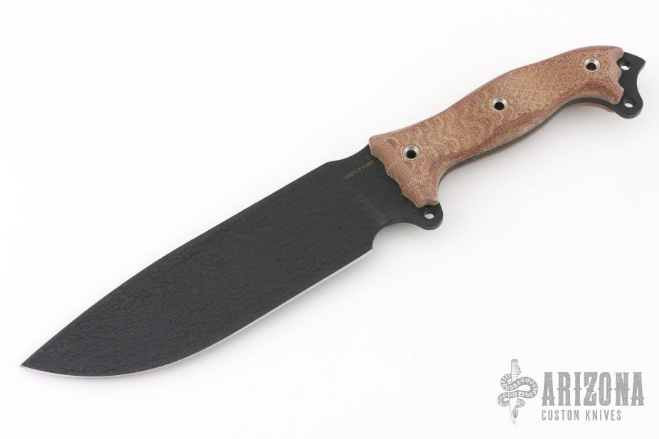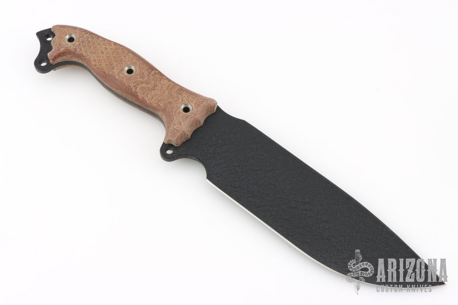 This Beating Heart by Busse features a black coated blade with .222" blade thickness and 2.261" blade depth, full tang construction. The handle has natural canvas micarta scales. Excellent condition.
