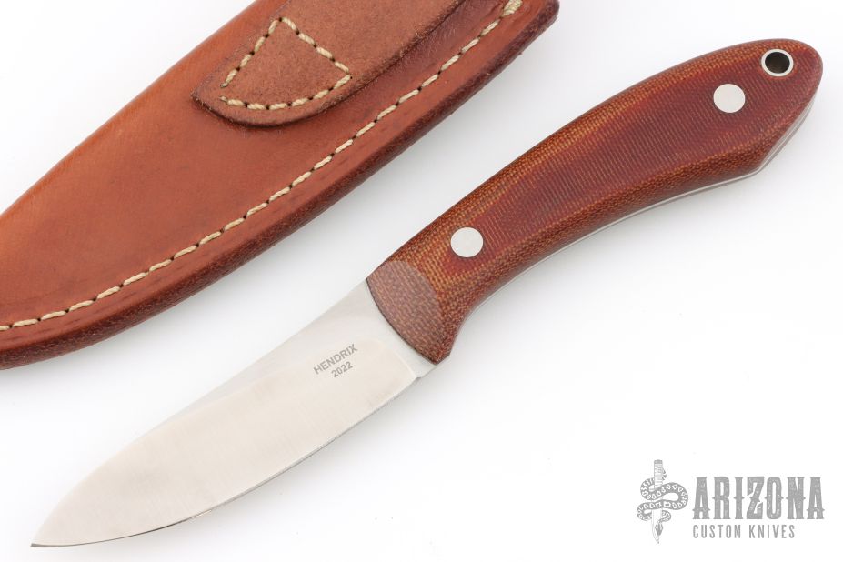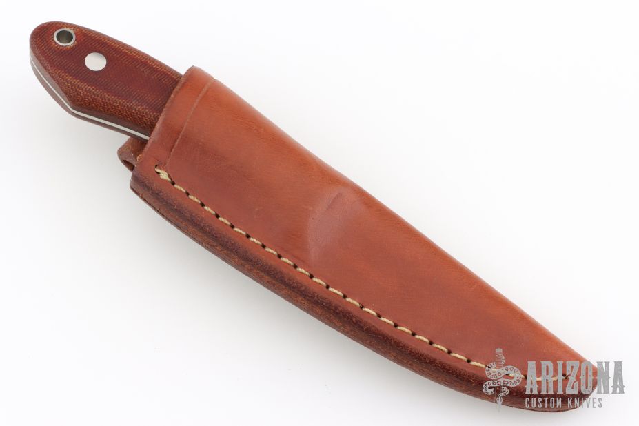 This Model 11 features a satin finished blade with .095" blade thickness and .892" blade depth, full tapered tang. The handle has natural canvas micarta scales. Excellent fit and finish. Includes a brown leather sheath. Has a couple extremely light scratches, otherwise excellent condition. Dated 2022