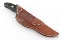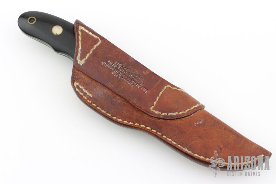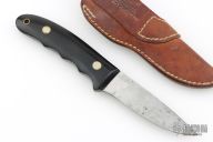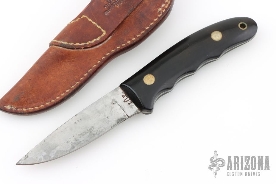 The Model L-1 by Lile Knives is a lightweight sporting and backpacking knife made by Lile Knives, .119" blade thickness and .889" blade depth. Satin finish. Tapered tang construction. Black linen micarta scales. Comes with a brown leather sheath. Has been used and sharpened, has some oxidation spots, otherwise good user condition.