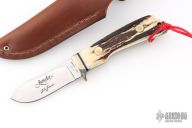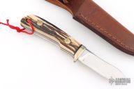 This knife by Junglee was designed by Tak Fukuta, it features a mirror polished blade with .107" blade stock and .841" blade depth, full tapered tang construction. The handle has a nickel silver guard and stag scales with black liners. Excellent condition. Comes with original box, papers and brown leather sheath. Excellent condition.