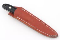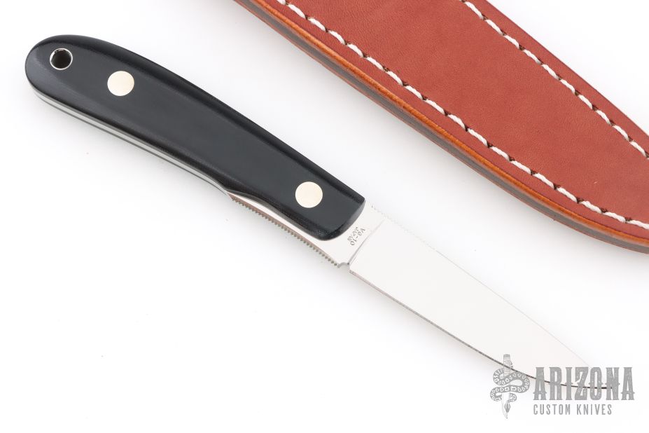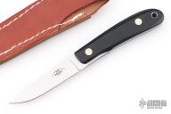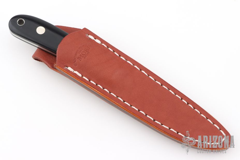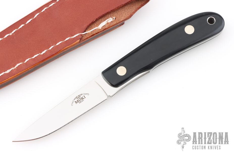This Moki custom hunter features a mirror polished blade with notched thumbrest, .115" blade thickness and .728" blade depth, full tang construction. The handle has black linen micarta scales. Comes with original box, papers and brown leather sheath. Excellent condition.