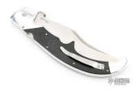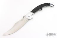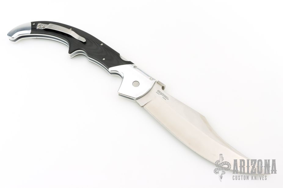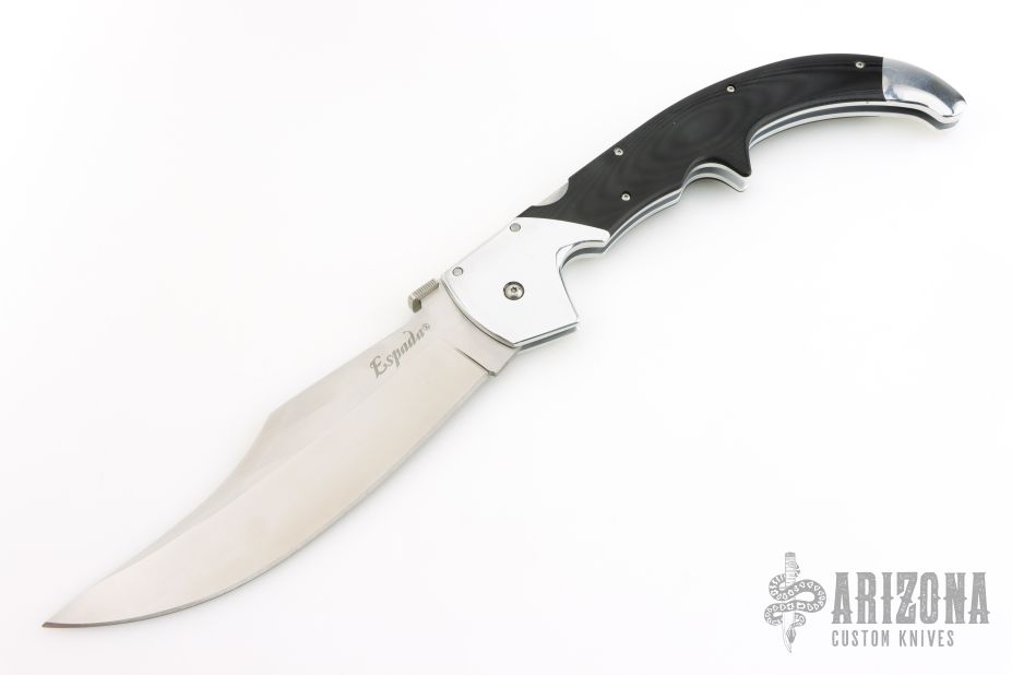 Like the swords of old the Espada’s are not for the weak, timid, faint of heart or those desiring another spring assisted play toy. Just pick one up and you’ll see what we mean! Definitely not politically correct, they are huge yet surprisingly well balanced and feature dramatically upswept clip point blades that are ideal for cutting, slashing and piercing. Made from vacuum heat-treated and sub-zero quenched Japanese 8A stainless steel and hollow ground to a thin, razor sharp edge, they will cleave through just about any obstacle or target in their path. To make your hand the real master of these awesome blades we have paired them with state of the art pistol grip handles. Strongly curved and equipped with multiple finger grooves and even a sub-hilt in the two larger models, they work perfectly in either a forward or reverse grip while offering unprecedented retention and reach through multiple grip extension options. To minimize overall weight and maximize strength and rigidity, we have CNC machined the frames and integral bolsters of the Espada’s handles from 7075 Aluminum billets. While quite costly, this material rivals even Titanium in strength and can endure years of the hardest abuse. Finally to make the handle as beautiful as it is effective and strong, we have mirror polished the dovetailed bolsters and attached glossy black G-10 handle scales using the latest high tech fasteners. We don’t believe any tactical folder can make a credible claim to being a “pocket sword” without possessing an incredibly strong and reliable lock and the Espada’s are no exception. That’s why we have equipped each model with our new multi-patented TRI-AD lock. Designed by Andrew Demko, the TRI-AD is unsurpassed in resisting positive pressure from the edge (cutting, slashing and chopping), negative pressure from the point (piercing, digging and chiseling), and impact pressure (whacks on the back of the spine of the blade) by diverting these forces first to its unique stop pin and then throughout the entire handle frame. At first thought, carrying a “pocket sword” as big and heavy as the Espada may seem impractical. However, after much experimentation, we have found this is not the case. Even the biggest model can be carried discreetly and unobtrusively in the front pocket of most pants and when clipped to the waistband and covered by a “bloused” shirt or sweater they totally disappear. Then in an emergency they can be drawn and opened in a single motion by snagging the patented thumb plate on the edge of a pocket."