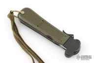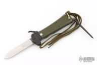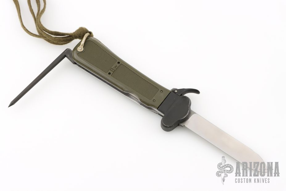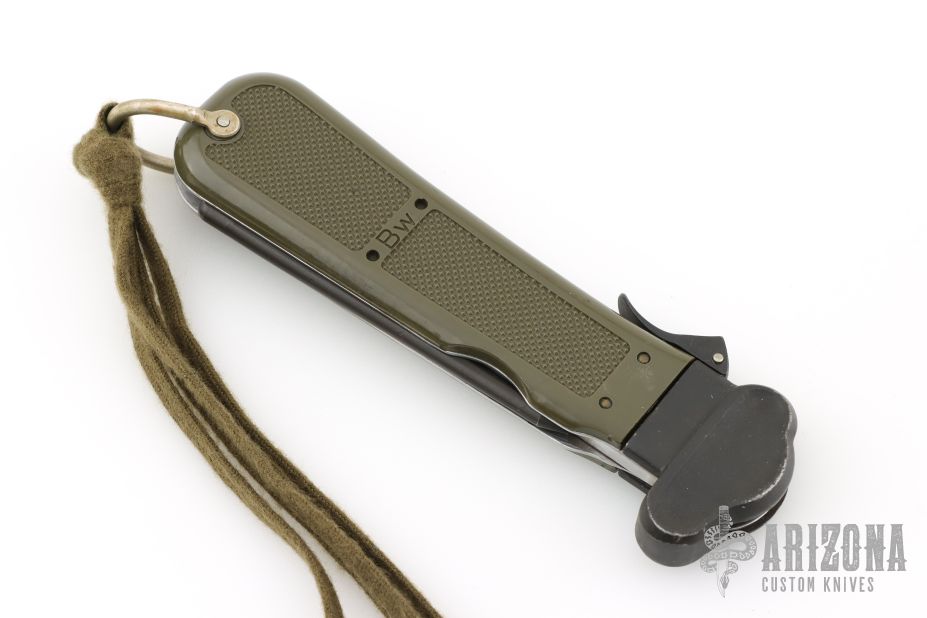 This AES 83 Gravity knife by Eickhorn Solingen features a satin finished blade. Blade deploys with gravity. The handle is black/green plastic with folding marlin spike. Has some scuffs and scratches, otherwise good condition.