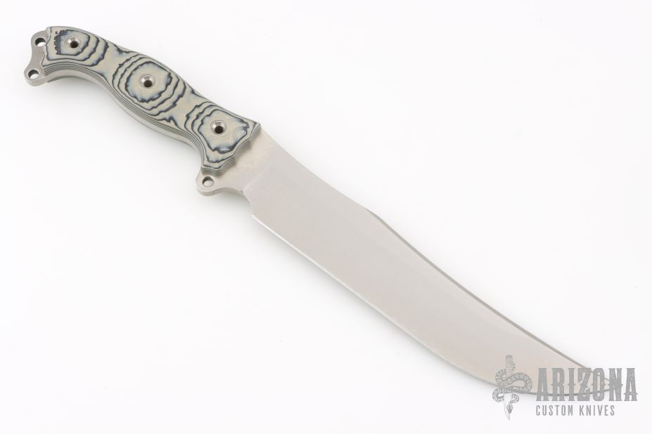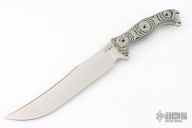 This Nano Fusion Warpatch by Busse features a satin finished blade with .211" blade thickness and 1.682" blade depth, full tang construction. The handle has black/tan G-10 scales. Excellent condition.