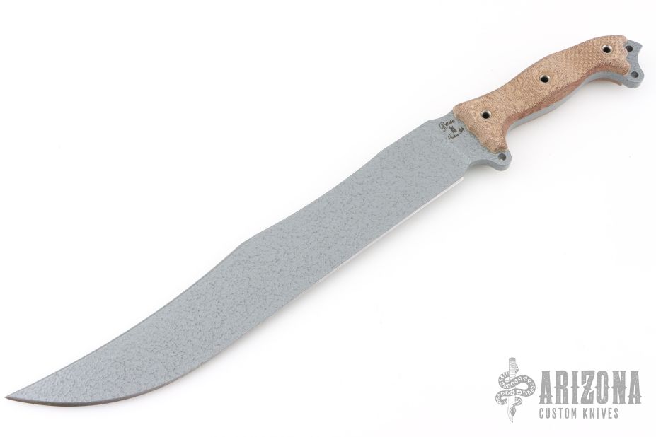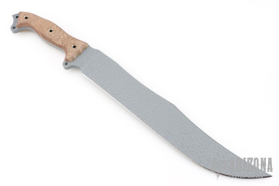 This MOAT by Busse Custom Shop features a clip point blade with hammered silver coating, .348" blade stock and 2.232" blade depth, full tang construction. The handle has natural canvas micarta scales and an extended tang with lanyard holes. Excellent condition.