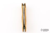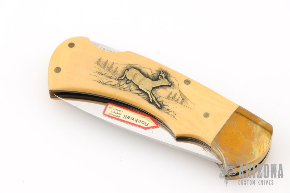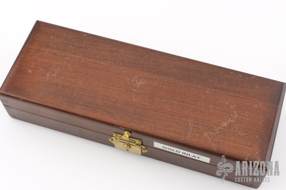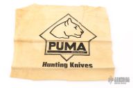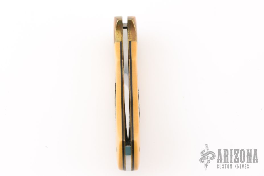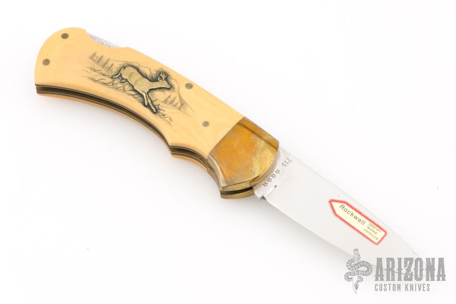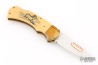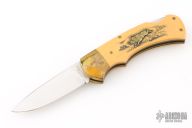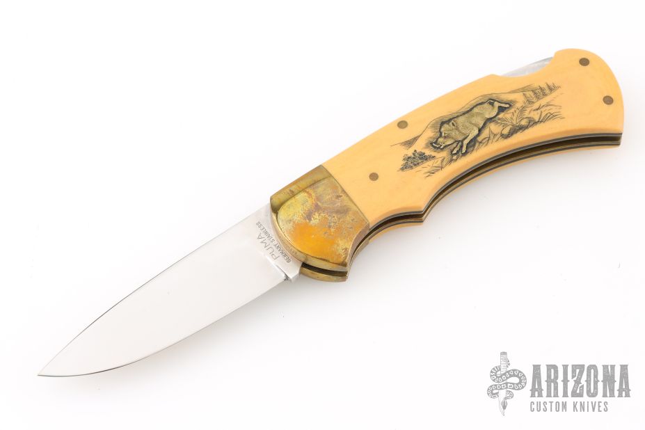 This Four Star Lockback from Puma Knives features a mirror finished drop point blade. The handle has brass bolsters, ivory paper micarta scales with black liners, brass liners and pin with a stainless backspacer. The handles have been Scrimshawed, and have gold overlays. Comes with original box and papers. Has a couple light scratches, otherwise Excellent condition.