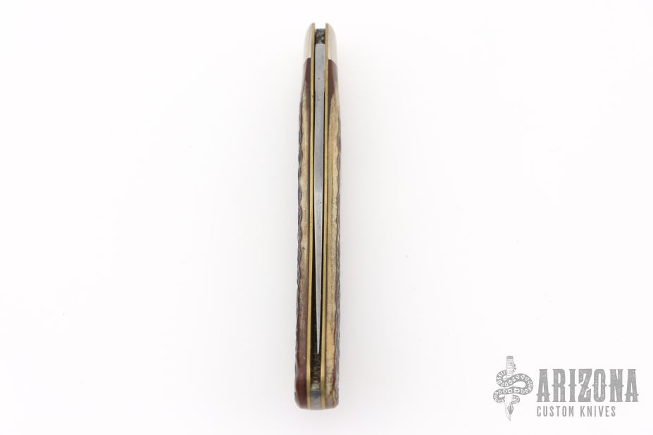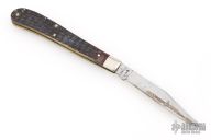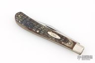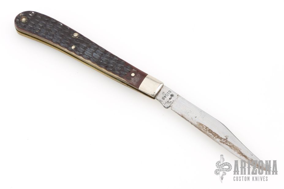 This Slimline Trapper by Case features a satin finished blade with nail nick. The handle has nickel silver bolsters, jigged red covers, with a nickel silver shield, brass liners and stainless spring. Has some scuffs, scratches, and patina. Good condition for its age, fair condition overall.
