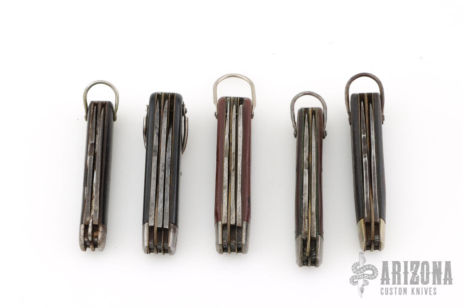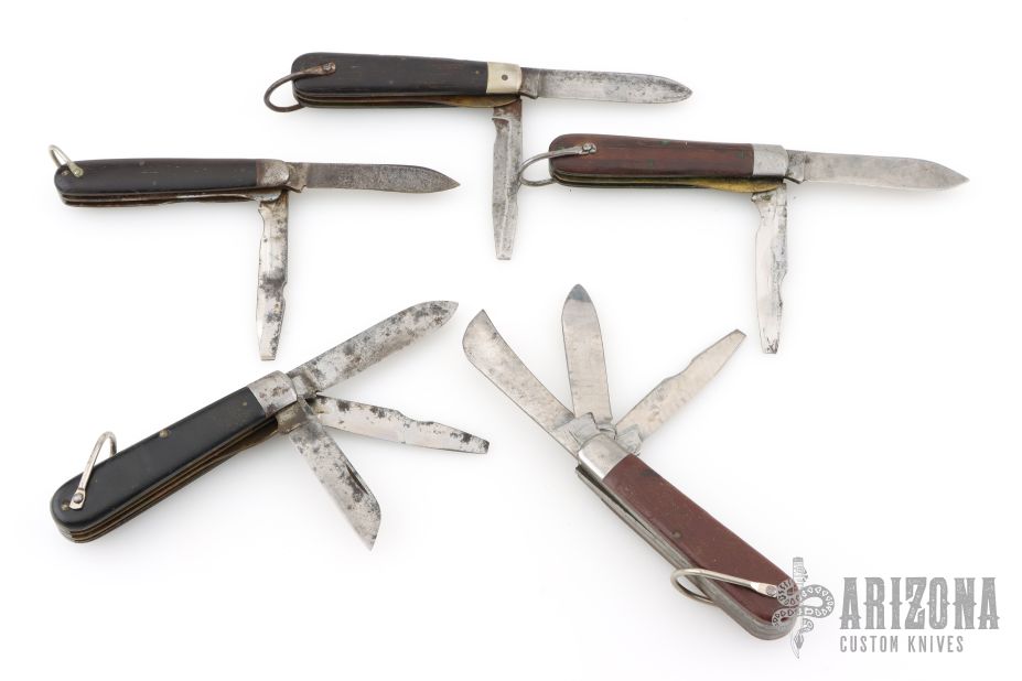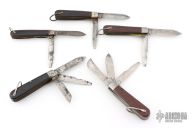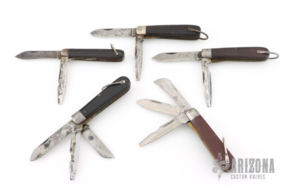 Lot of five vintage slipjoints. Some have two and some have three blades. They all have scuffs, scratches, light rust, and patina. Good/fair/poor condition for their age.