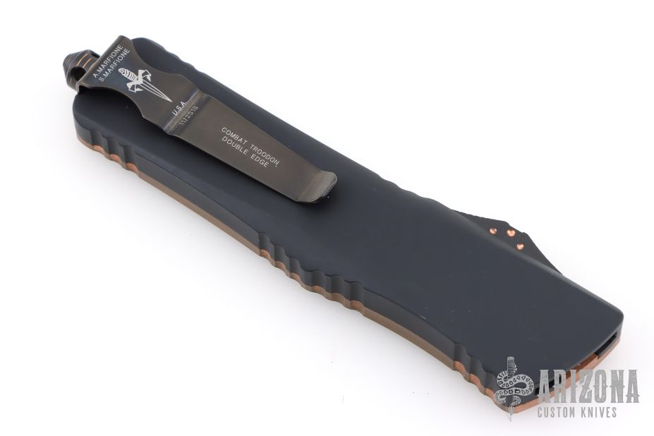 This Combat Troodon by Marfione Custom Knives features a mirror polished double edged blade. The handle has a black aluminum frame with eggshell finished copper top and copper ringed hardware, tip down black stainless steel clip. Dated 11/2018. Comes with original box, zippered case and COA. Excellent condition.