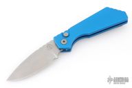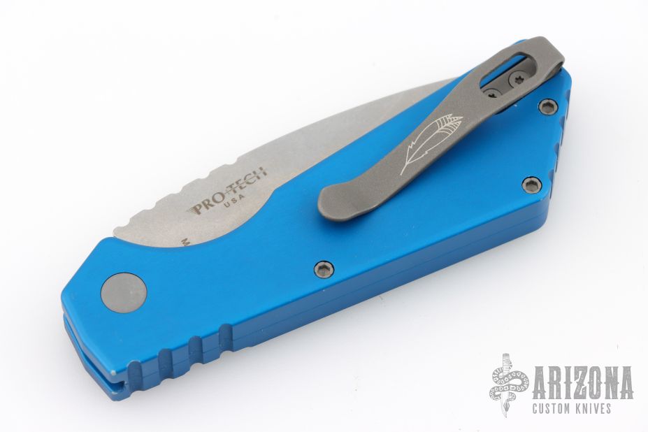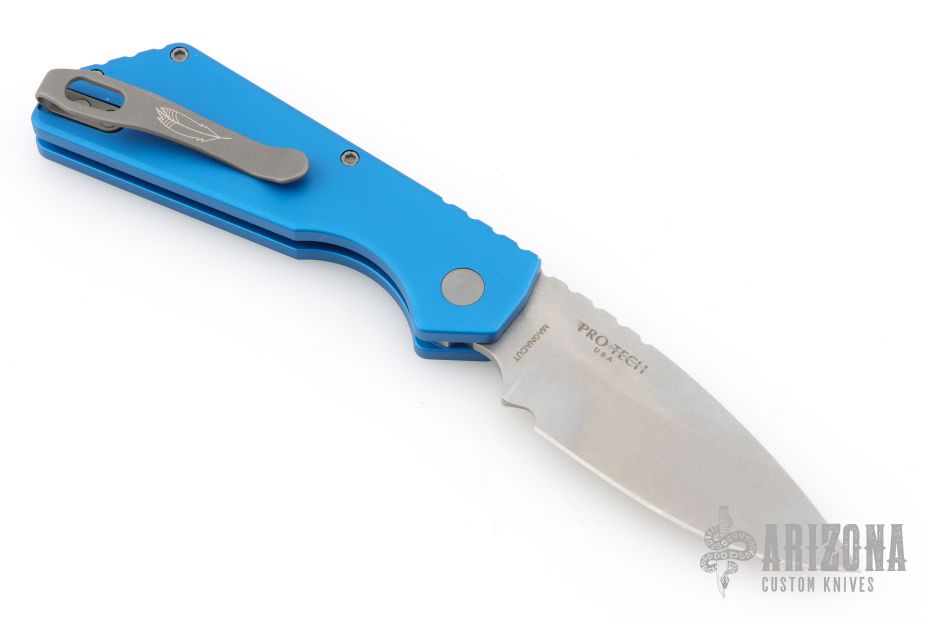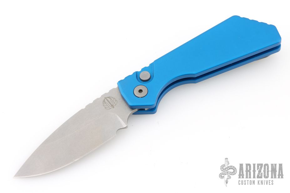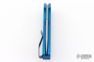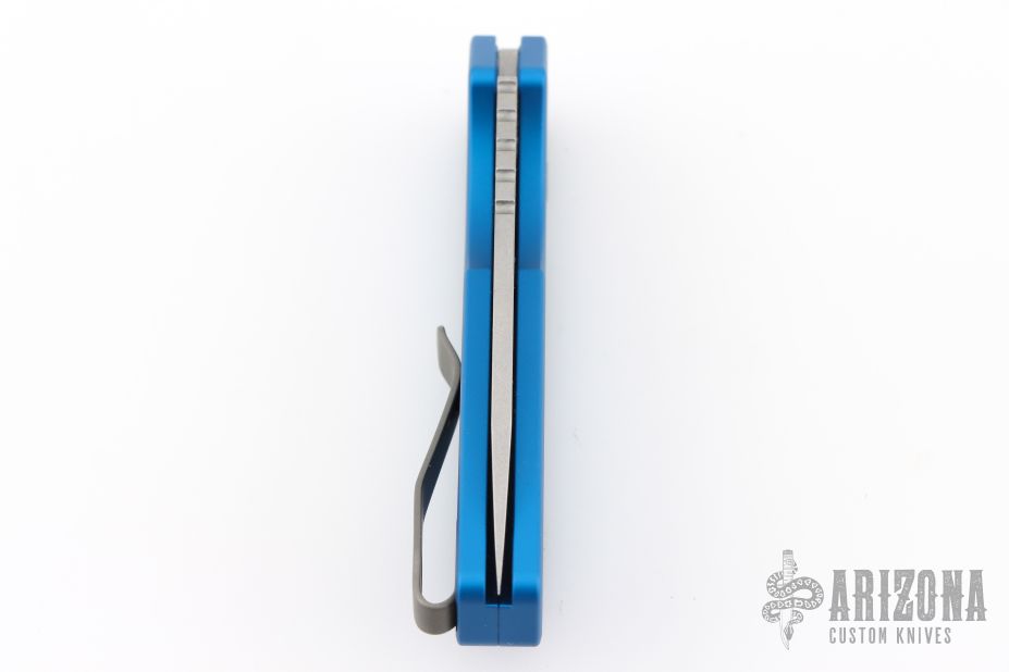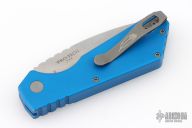 This Pro-Strider PT by Pro-Tech and Strider Knives features a tumbled finished blade with notched thumbrest. The handle has a blue aluminum frame with bead blasted hardware and a deep carry titanium tip up clip by Lynch NW. Includes the original box, clip, and papers. Has a couple light scuffs, and some minor wear on the front corners of the frame, otherwise good condition.