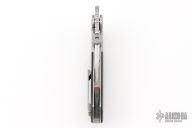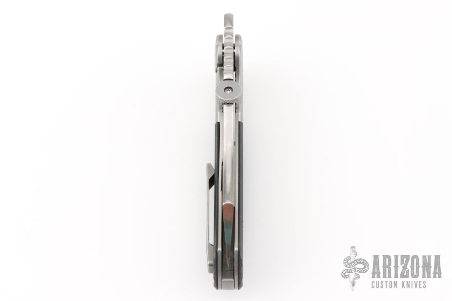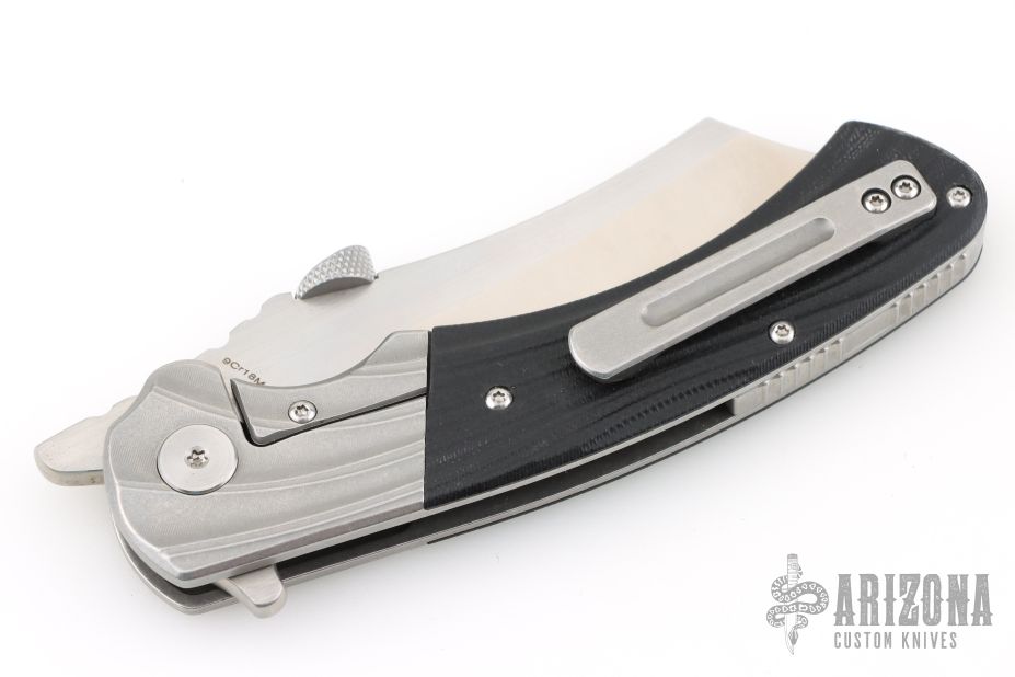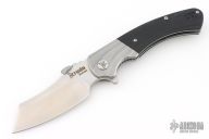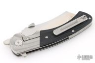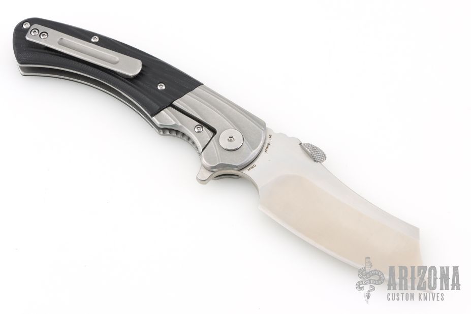 This DAO framelock flipper by Krudo Knives features a satin finished blade with knurled thumbdisc, notched thumbrest and flipper. The handle has a milled and tumbled titanium frame with black G-10 scales, stainless steel backspacer and tip up reversible stainless steel clip. Rides on bearings, nice detent, lockup and blade seating. Has some light scuffs, otherwise excellent condition.