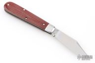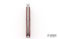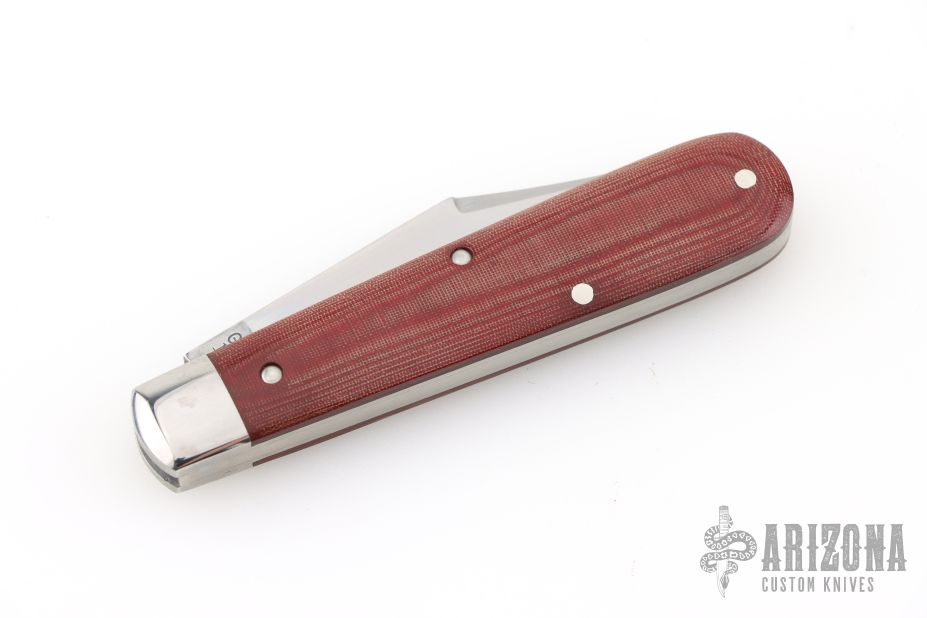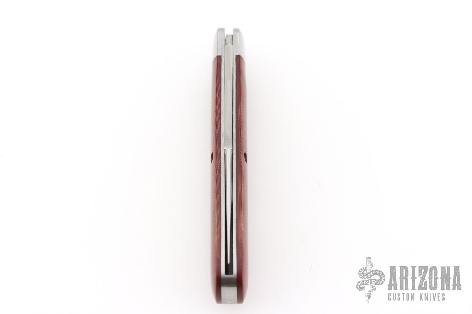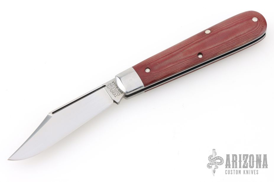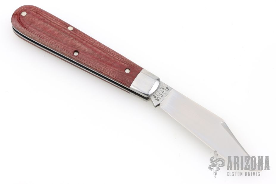 This slipjoint by Great Eastern Cutlery features a satin finished clip point blade with a single nail nick. The handle has stainless bolsters, red linen micarta covers, stainless steel liners and spring. Has half stop. Comes with original tube. Excellent condition. 243 made