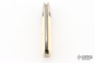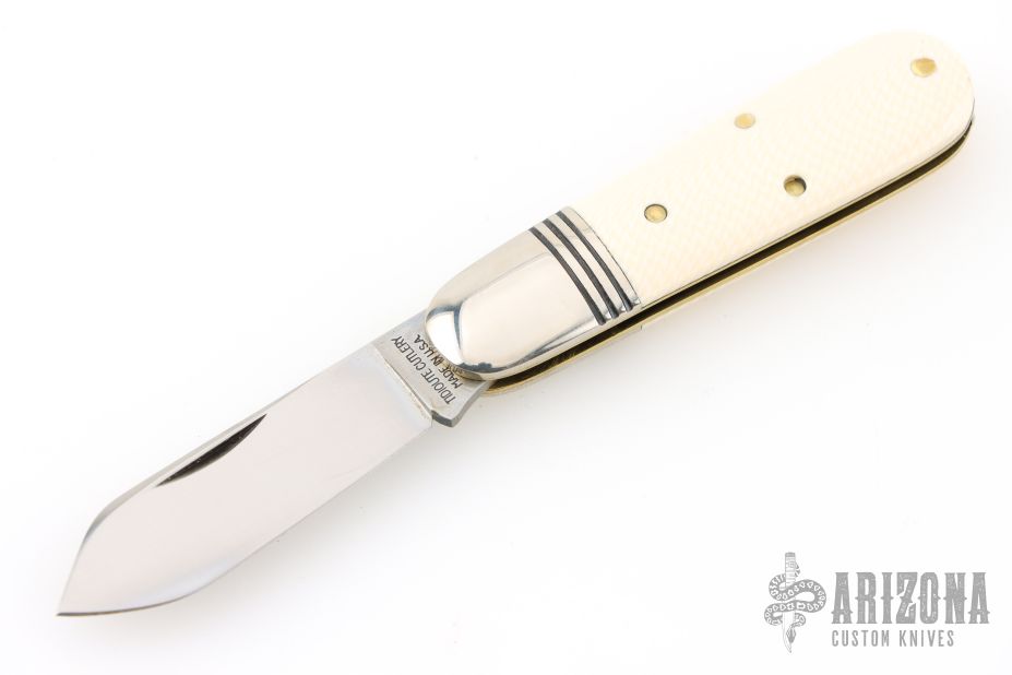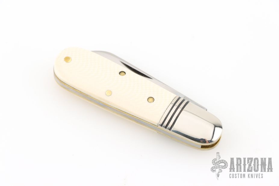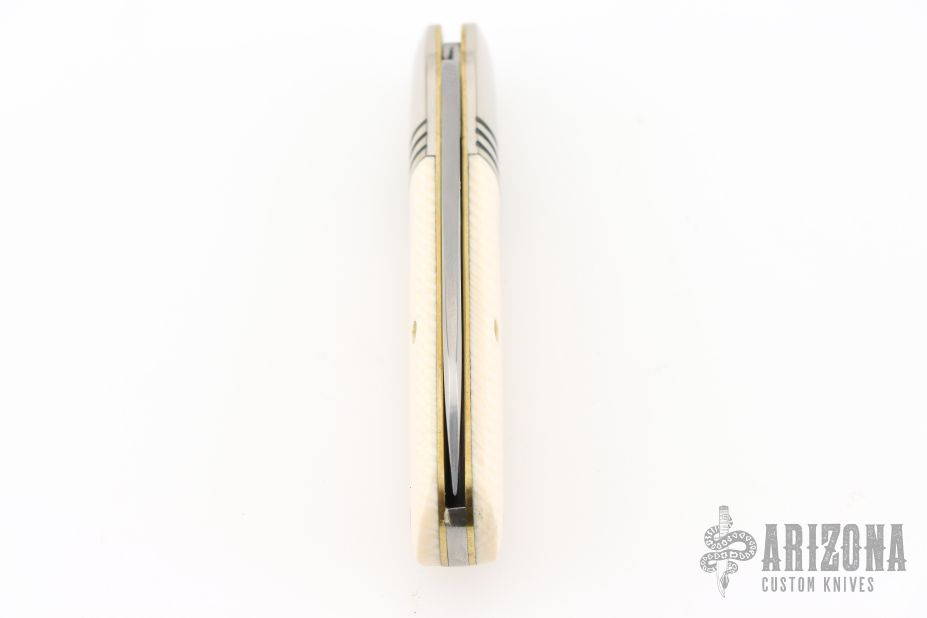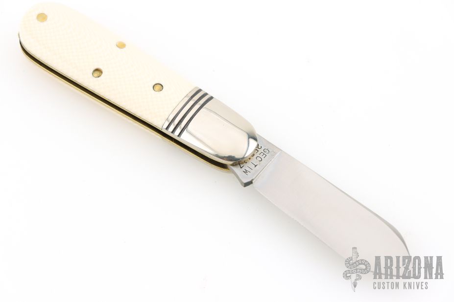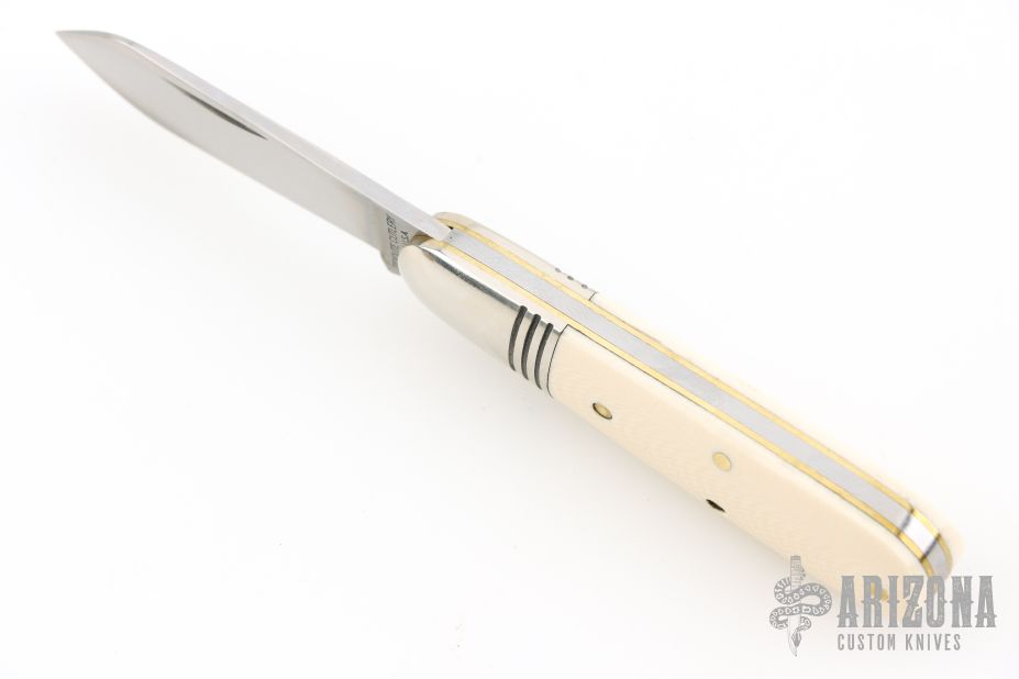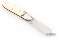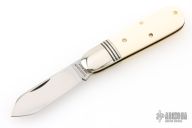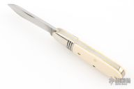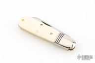 This Little Jack slipjoint by Great Eastern Cutlery features a satin finished blade with nail nick. The handle has nickel silver bolsters, unicorn ivory acrylic covers, brass liners and a steel spring. Has half-stop. Includes original tube. Excellent condition. 198 were made. This one is a Factory Second notified by the "S" on the blade.