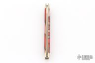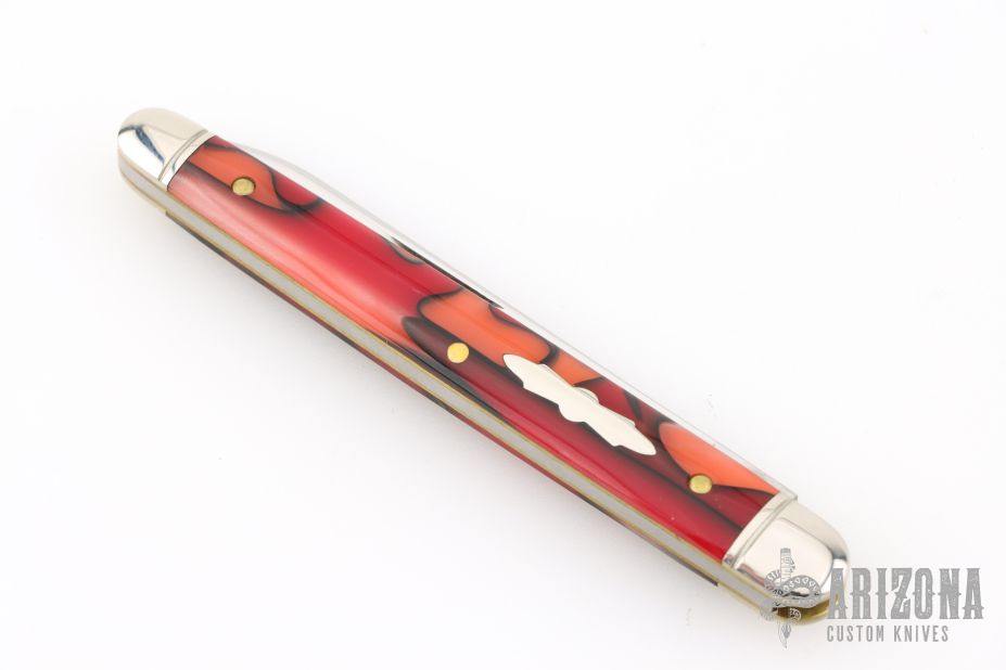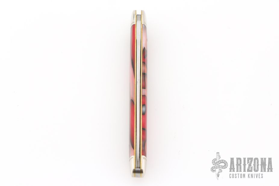 Handle: Apples & Oranges acrylic scales offer a unique look and striking visual appeal while being durable, weather resistant and easy to clean. The covers are flush fit between two polished and grooved nickel silver bolsters riding on brass liners with a classic pinned construction. A polished propeller shield completes the construction.